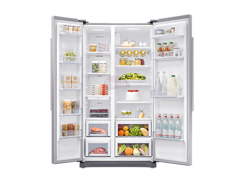 Samsung 540-litre Side-by-side Refrigerator RS54N3A13S8 Gross/Total capacity: 566 litres Net Capacity: 540 litres Net Height with Hinge (cm): 178.9 Net Depth with Door Handle (cm): 73.4 Net Weight: 98kg Twin Cooling System No Frost Technology (Frost-free) Multi-flow System All Around Cooling Tempered Glass shelves 5 Shelves Wine Rack Dairy Compartment 4 Door Pockets Egg Container (Egg Tray) Icemaker Tray Ice Tray Door Alarm Refrigerant: R600a Cyclopentane Insulation Compressor: Digital Inverter Compressor Energy Efficiency Class: A+ Interior LED Light Warranty | #KweliGotYou| Order Samsung 540-litre Side-by-side Refrigerator RS54N3A13S8; All-round Cooling, Frost-free, Digital Inverter Compressor online and enjoy free delivery across Uganda > Long warranty > Lifetime After-sales Support