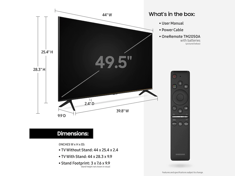 Samsung 55 inch Smart TV UA55AU7000 with DStv Kit Crystal Processor 4K Picture Processor Smart TV Powered by Tizen™ HDR (High-Dynamic Range) Crystal Display Boundless Design 4K UHD (3,840 x 2,160) resolution PurColor Dolby Audio Sound Output (RMS) 20 watts 2 Channel Speaker Multiroom Link Bluetooth Headset Support Wi-Fi Connectivity Wi-Fi Direct Bluetooth Smart Hub 4K Upscaling Works with Google Assistant Built-in Amazon Alexa, Google Assistant and Bixby Game Mode; Yes (Game Enhancer) Ethernet (LAN)USB HID Support Ambient Mode Eco Sensor (auto brightness) HDMI x3 USB x2 Composite In (AV) x1 Terrestrial / RF input Ethernet (LAN) Digital Audio Out (Optical) Audio Return Channel Support (via HDMI port) RS232C: Supports USB to Ex-Link Adapter DTV Tuner Analog tuner/Free-to-air receiver Full DStv HD Zapper Kit plus installation | #KweliGotYou| Order Samsung 55 inch Smart TV UA55AU7000 with Full DStv Kit ; 4K UHD, Bluetooth, Phone Mirror with Tap-View, Free-to-Air, Bluetooth online and enjoy free delivery across Uganda > Long warranty > Lifetime After-sales Support