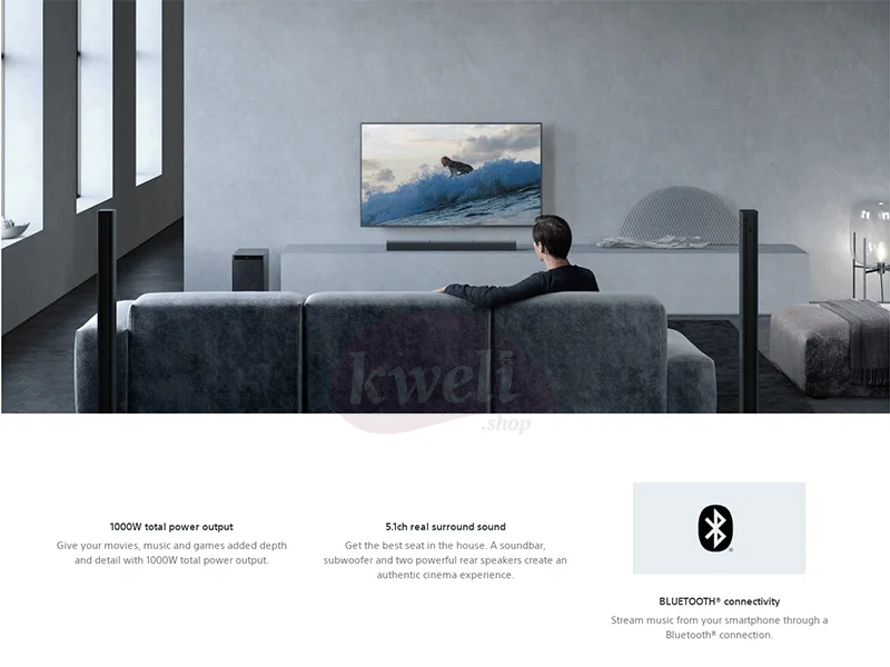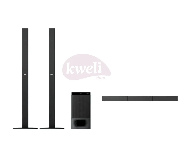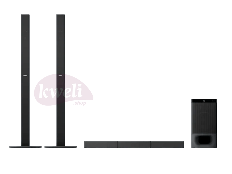 Sony 5.1ch Home Cinema Soundbar System Fill the room with 5.1ch real surround sound Tall-boy speakers for true surround sound 1000 watts output power Stream music from your smartphone with Bluetooth® Browse and control easily with Sony | Music Center app Easy connection with HDMI ARC USB audio playback DTS format support Dolby® Digital 1-year warranty What's In The Box Remote Commander, HDMI Cable, Wall Hanging Template, Quick Setup Guide, Instruction Manual, Batteries | #KweliGotYou| Order Sony 5.1ch Home Cinema Soundbar System with Bluetooth, 2 Tallboy Speakers,1000 watts, Dolby® Digital Audio, DTS Surround Sound | HT-S700RF online and enjoy free delivery across Uganda > Long warranty > Lifetime After-sales Support