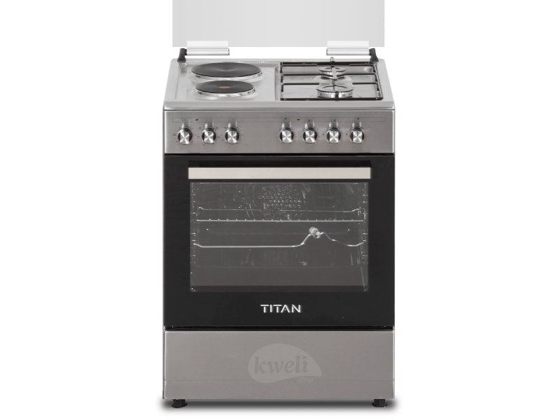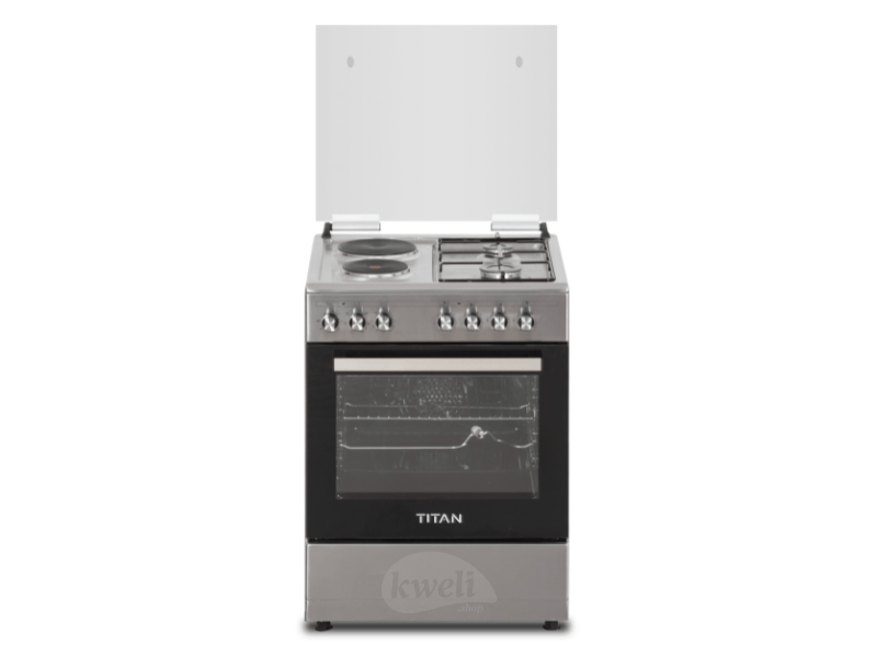 Titan 2 Gas + 2 Electric Cooker TN-FC6220XBS 60cm wide cooker. H: 85cm, D: 60cm. 2 Gas burners with automatic electric ignition 2 Electric Hot plates Electric Oven Electric Grill & Rotiserrie Oven Timer Enamel Pan Support 1-year warranty | #KweliGotYou| Order Titan 2 Gas + 2 Electric Cooker TN-FC6220XBS; 60cm Cooker, Electric Oven & Grill, Rotisserie online and enjoy free delivery across Uganda > Long warranty > Lifetime After-sales Support