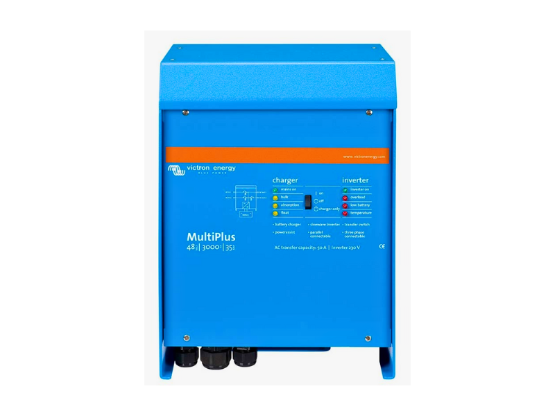 Victron MultiPlus 3kVA/2.4kW 48V Inverter Charger 48/3000/35-50 230V VE.Bus General Specifications Inverter Power Output (VA): 3,000 VA Continuous Output Power (W): 2,400 W (at 25°C) Peak Power: 6,000 W Input Voltage Range (DC): 38 – 64 V Nominal Battery Voltage: 48V Output Voltage (AC): 230 V ± 2% Output Frequency: 50 Hz or 60 Hz ± 0.1% Battery Charger Charge Voltage (Absorption): 57.6 V Charge Voltage (Float): 55.2 V Storage Mode Voltage: 52.8 V Charge Current: 35 A Starter Battery Charge Current: 4 A Temperature Sensor: Included Compatible Battery Types Lead-Acid Batteries: AGM, Gel, and Flooded types. Lithium-Ion Batteries: Compatible with lithium systems, supporting external Battery Management Systems (BMS). Transfer Switch AC Transfer Capacity: 50 A Efficiency Maximum Efficiency: 94% Zero Load Power Consumption: In AES Mode: 15 W In Search Mode: 8 W Environmental Specifications Operating Temperature Range: -40°C to +65°C (fan-assisted cooling) Humidity (Non-condensing): Max. 95% Physical Specifications Dimensions (HxWxD): 362 x 258 x 218 mm Weight: 19 kg Enclosure Material & Colour: Aluminium, Blue (RAL 5012) Protection Category: IP21