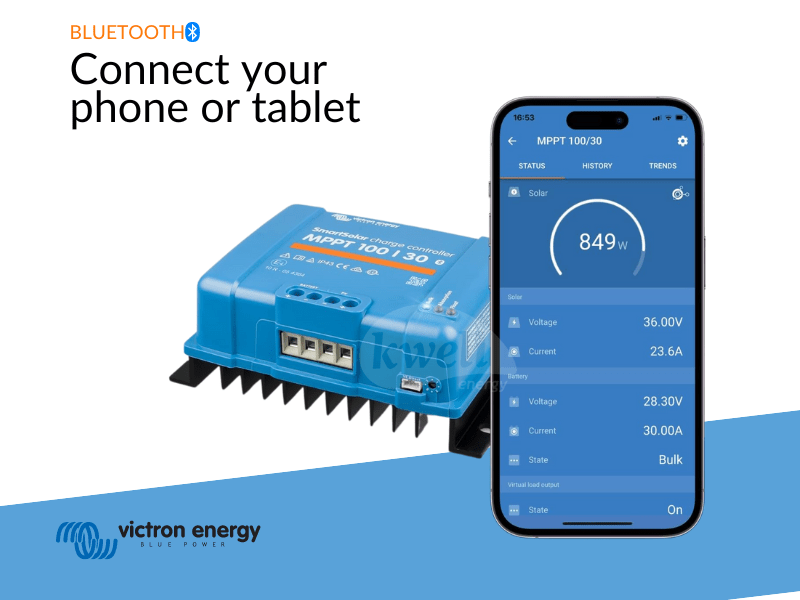 Victron SmartSolar Charge Controller MPPT 100/30 Rated Charge Current: 30 A, Maximum PV Open Circuit Voltage: 100 V Ultra-fast MPPT: Improves energy harvest by up to 30% compared to PWM controllers. Advanced MPPT Detection: Maximises energy harvest even in partial shading conditions. High Efficiency: Features an outstanding conversion efficiency of over 98% without the need for a cooling fan. Flexible Charge Algorithm: Fully programmable with multiple pre-set algorithms. Extensive Protection: Includes over-temperature, PV short circuit, PV reverse polarity, and reverse current protection. Bluetooth Smart Built-in: Allows for wireless setup, monitoring, updates, and synchronisation. VE.Direct Port: For wired connections to various devices. Battery Recovery Function: Can initiate charging for batteries discharged to zero volts and reconnect to fully discharged Li-ion batteries.