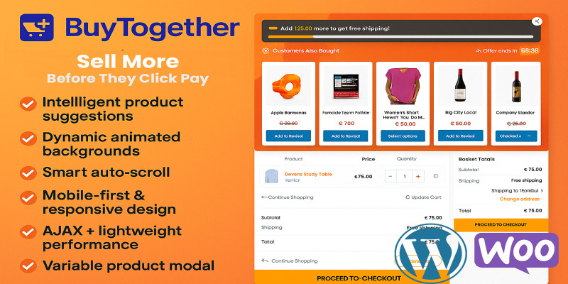 BuyTogether - WooCommerce Smart Upsell Plugin. Increase cart value with smart product suggestions, countdown timers, and free shipping progress bars for WooCommerce stores.