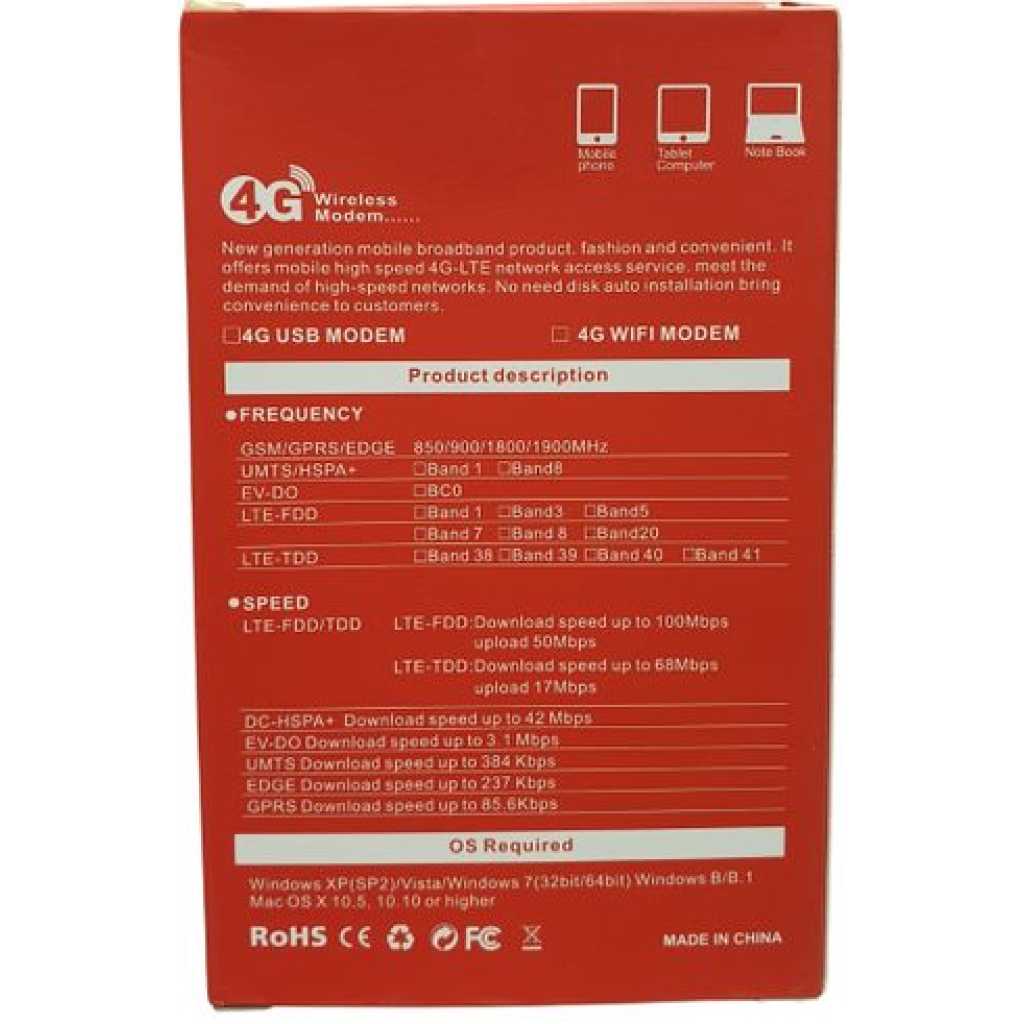 BVOT 4G LTE Simcard Unlocked Wi-Fi Modem/Router Wingle Hotspot – White. Bvot modem wifi wingle 4G LTE Wi-Fi Modem/Router lets you share a fast mobile Internet connection with multiple PCs and mobile devices wherever you go. It oers 4G LTE compatibility for fast downlink and uplink data rates, so you get the fastestmobile connectivity available, even when you’re on-the-go. You’ll have access to smooth online video, lag-free online gaming, and highspeed surng on any device, from anywhereConnectivity • USB 2.0 plug connects to any PC or laptop computer • SIM slot allows you to access the Internet using your mobile service • Wireless 802.11b/g/n to create high-speed wireless networks Mobile Connections • Data rates of up to 150 Mbps download and 50 Mbps upload1 • LTE/DC-HSPA+/HSPA/WCDMA support for the latest in mobile network technology • GSM/GPRS/EDGE support for legacy mobile plans and fallback in the absence of 4G LTE Portability • Small enough to slip right in your pocket • Internal Wi-Fi and LTE antennas keep it compact Easy to Set Up, Easy to Use • Access your SIM card’s phonebook and SMS messaging right from your web browser • Built-in drivers and software mean that no CD-ROM drive is required • LED indicators let you know the status of your connection instantly Key Features: BVOT 4G LTE Simcard Unlocked Wi-Fi Modem/Router Wingle Hotspot – White. For any GSM carrier Works with any Data enabled SIM card 4G LTE USB Modem 150Mbps Maximum downlink MicroSD slot up to 32GB (Can be used as a flash drive) WIFI MODEM Good Quality Very Fast Easily Affordable Easy to Maintain Perfect size