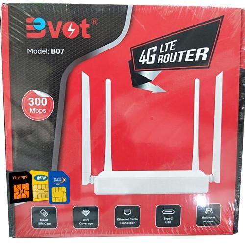 The Bvot 4G LTE Router B07 provides high-speed internet access on the go. It supports multiple devices, is easy to set up, features a compact design, and its have Type-C Charging Port you can use a power bank for portable usage , making it ideal for travel or areas with limited broadband. This router take any SIM card for WiFi wireless coverage Wifi: all networks. Network at all locations, easy for other networks of equipment. Equipped with several omnidirectional rotating antennas, it has high wireless coverage, supports multi-user access at the same time, a simple and easy-to-use Ul web interface. Broadband connectivity: 4G BVOT routers offer fast and reliable Internet connectivity, ideal for areas with limited access to traditional broadband services. Versatility: These are versatile devices that can be used as main Internet connections, as temporary configurations or as backup options for businesses and households. Portabilité Portability: Many 4G BVOT routers are compact and portable, allowing users to transport them easily for Internet access on the move, for example when travelling or outdoor events. Input voltage: 5 V 1 A – WebUl IP address: 192.168.100.1 Easy installation: They usually have simple installation processes, allowing users to easily configure them and start using them quickly. Dual-band Wi-Fi: Some BVOT routers have dual-band Wi-Fi support, offering users 2.4 GHz and 5 GHz frequency bands for improved wireless performance and flexibility. Secure connections: BVOT routers are equipped with advanced security features such as WPA/WPA2 encryption and firewall protection, ensuring secure internet connection and protection against potential cyber threats. Stable performance: They offer stable performance even in harsh environments or during periods of advanced use, thanks to advanced antenna technology and signal optimization functionalities. Remote management: Some models support remote management capabilities, allowing users to monitor and manage their router settings and Internet connection from anywhere via a web interface or mobile application. Rentable Cost-effective: 4G BVOT routers can be a cost-effective solution for Internet access, especially in areas where the installation of traditional broadband infrastructure is impractical or expensive.