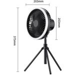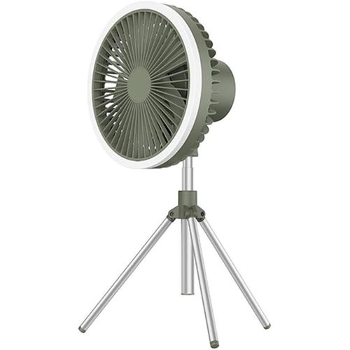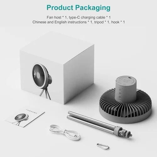 Product Name: Tripod Fan Colour: Khaki, Green, Black Product size: 180*180*115mm (main fan) 192*183*342mm (tripod fan) Product weight (bare): 560g Rated input: DC5.0V/2.0A Operating current: 0.3-1A Rated power: ≤4W Battery capacity: 10000 mA Battery life: approx. 27 hours for 1-speed wind, approx. 13 hours for 2-speed wind, approx. 8 hours for 3-speed fan Charging time: approx. 4.5 hours Mainframe: ABS/PP/Silicone/Electronic components Tripod: silicone/aluminium Product comes with accessories details: Fan main unit*1, tripod*1, hook*1, Type-c charging cable*1, English and Chinese manual*1 Operating instructions: Fan function: Press the switch once to start 1 speed, press the switch a second time to start 2 speeds, press the switch a third time to start 3 speeds, press the switch a fourth time to turn off the fan. The above cycle. Light function: Press the switch once to activate 1 light level, press the switch a second time to activate 2 light levels, press the switch a third time to activate 3 light levels, press the switch a fourth time to switch off the light. The above cycle. Timer function: press the switch once to activate the 1h timer, press the switch a second time to activate the 3h timer, press the switch a third time to activate the 5h timer, press the switch a fourth time to switch off the timer. The above cycle. Indicator light description: blue light when the output USB is working, red light for charging status, green light for full charge. Product selling point: Dual use for hanging and standing Four wind speeds Seven-colour ambient light Remote control with automatic head shaking USB emergency charging port Removable washable grille Retractable stand lift