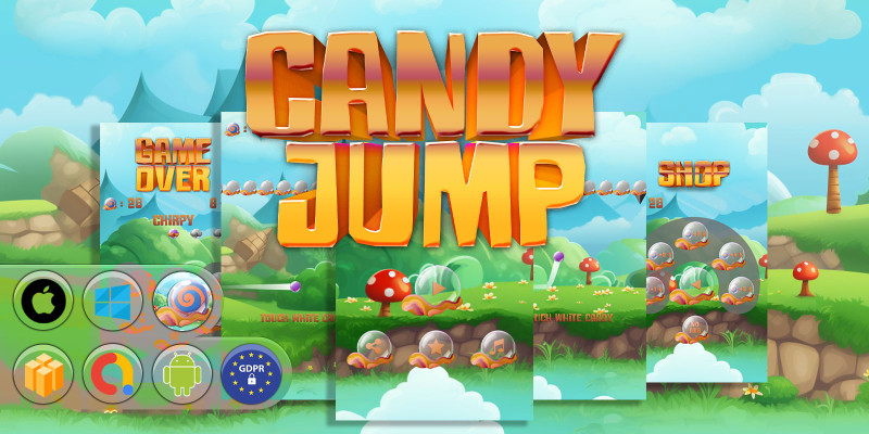 Candy Jump - Buildbox Template. Jump through sweet obstacles, collect treats, and unlock multiple characters in this endless arcade adventure.