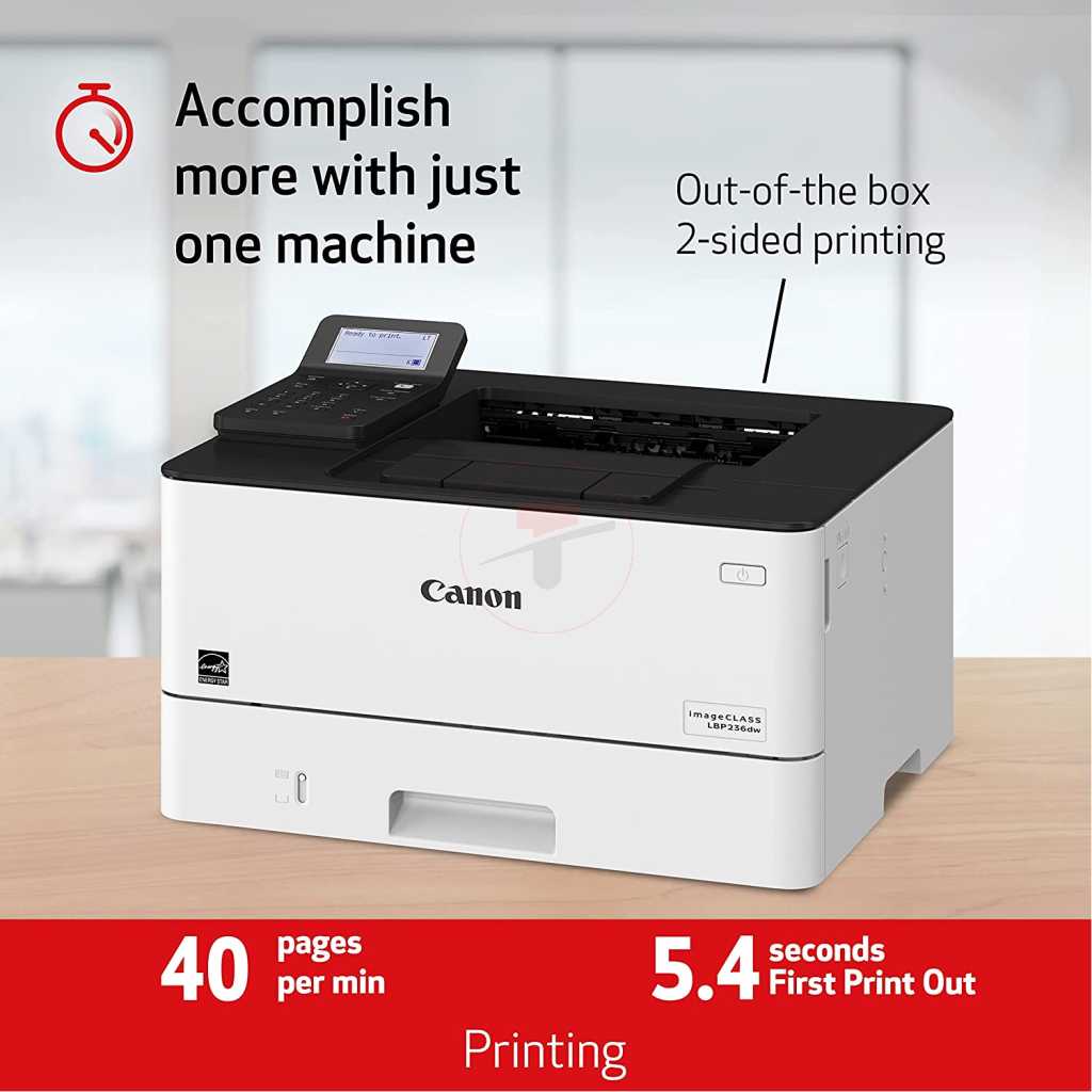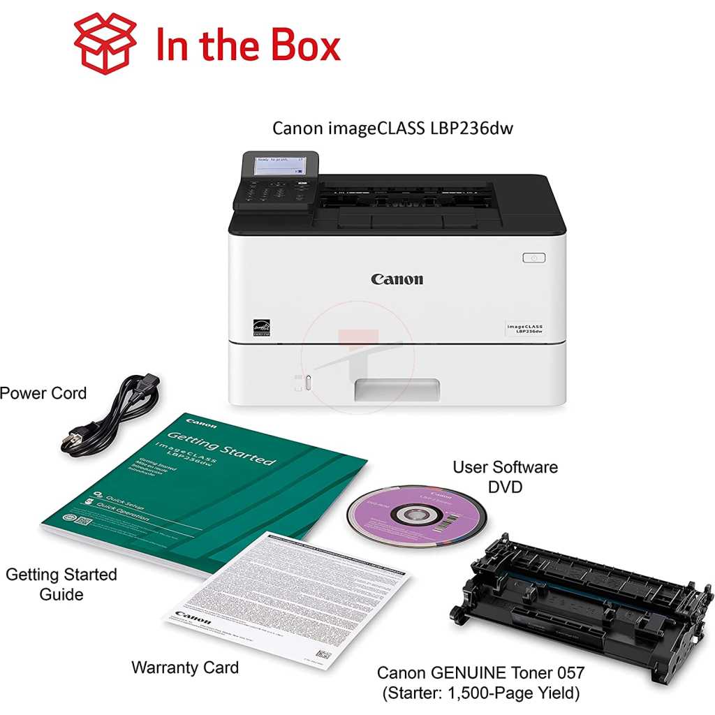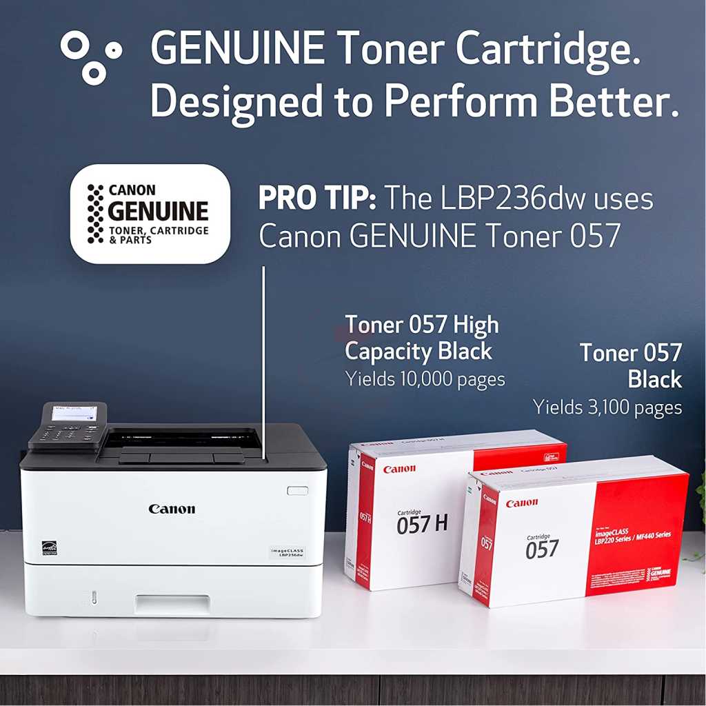 Key Features: Canon imageCLASS LBP236dw – Wireless, 40ppm, Duplex, Mobile-Ready Laser Printer – White. Print up to 40 ppm. Print up to 8.5″ x 14″. 900-sheet maximum paper capacity. Standard one-year limited warranty standard. Environmentally concious settings help save paper and energy. Print resolution of up to 1200 x 1200 dpi Warm-up time of approx. 14 seconds or less from power on First-print-out time of approx. 5.5 seconds or less Supports UFRII, PCL 5e, PCL6, and Adobe PostScript3 printer languages 250-sheet cassette, 100-sheet multi-purpose tray, and optional 550-sheet cassette for a maximum paper input capacity of up to 900 sheets Supports various media types and sizes, including plain paper, recycled paper, heavy paper, thin paper, colour paper, coated paper, label, post card, envelope, etc. Automatic double-sided printing USB 2.0 Hi-Speed, 10BASE-T/100BASE-TX/1000Base-T, Wireless 802.11b/g/n, and Wireless Direct Connection interfaces Compatible with Windows® 11 / Windows® 10 / Windows® 8.1 / Server® 2022 Mac OS X version 10.11 & up Linux Supports various network protocols and security features for print management and data protection Remote User Interface (RUI), Department ID Management, Toner Status Tool, iW Enterprise Management Console, and eMaintenance for easy device monitoring and maintenance Uses Canon Genuine Toner 057 Black (yields 3,100 Pages) and 057 High Capacity Black (yields 10,000 Pages), ISO/IEC standard
