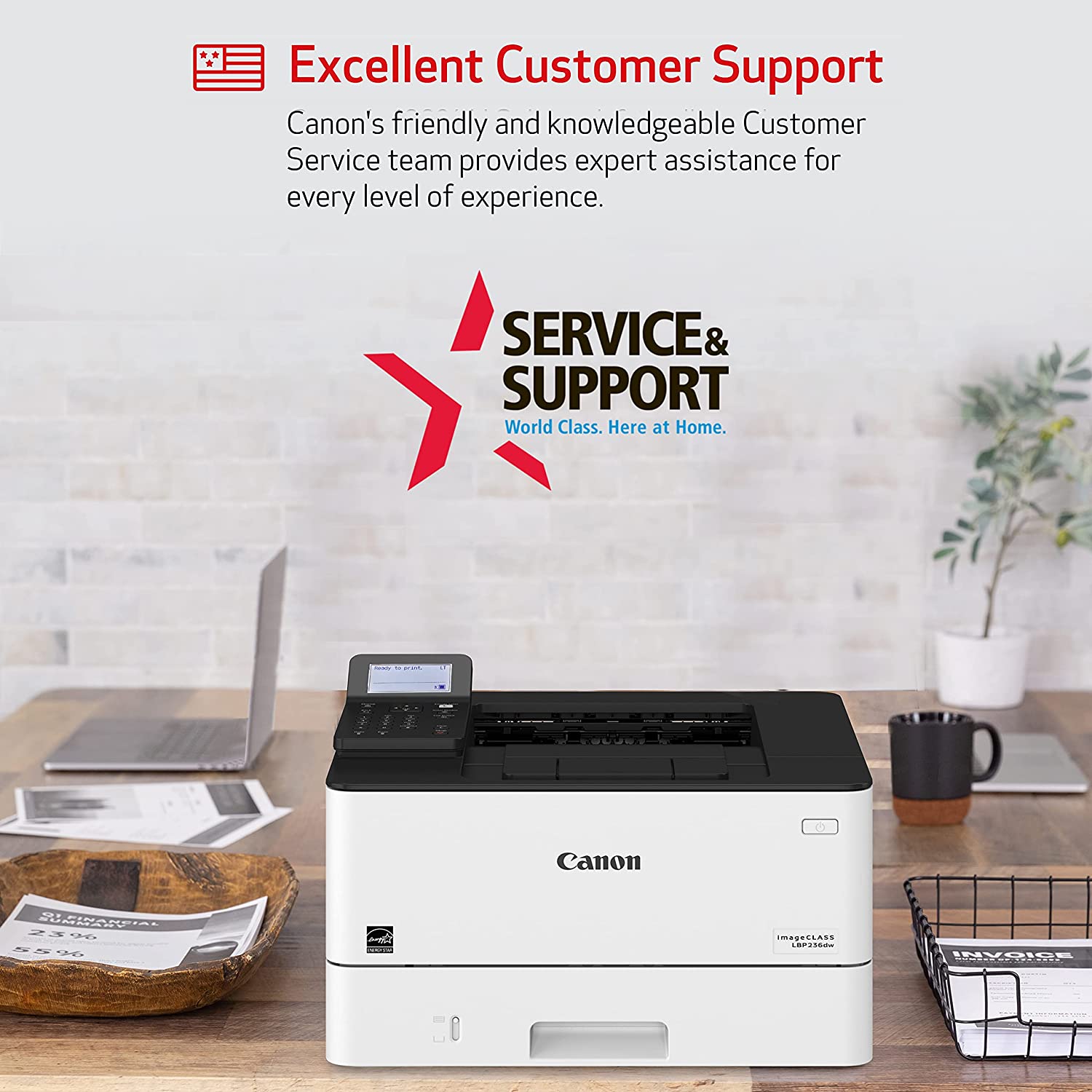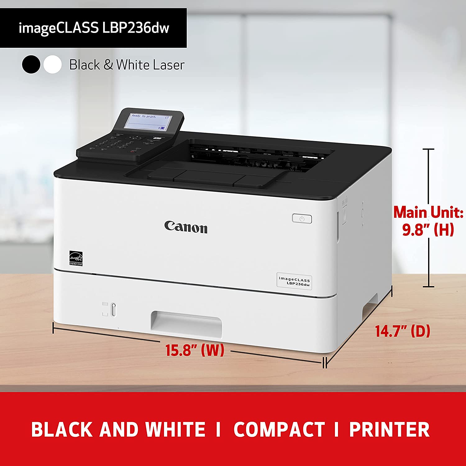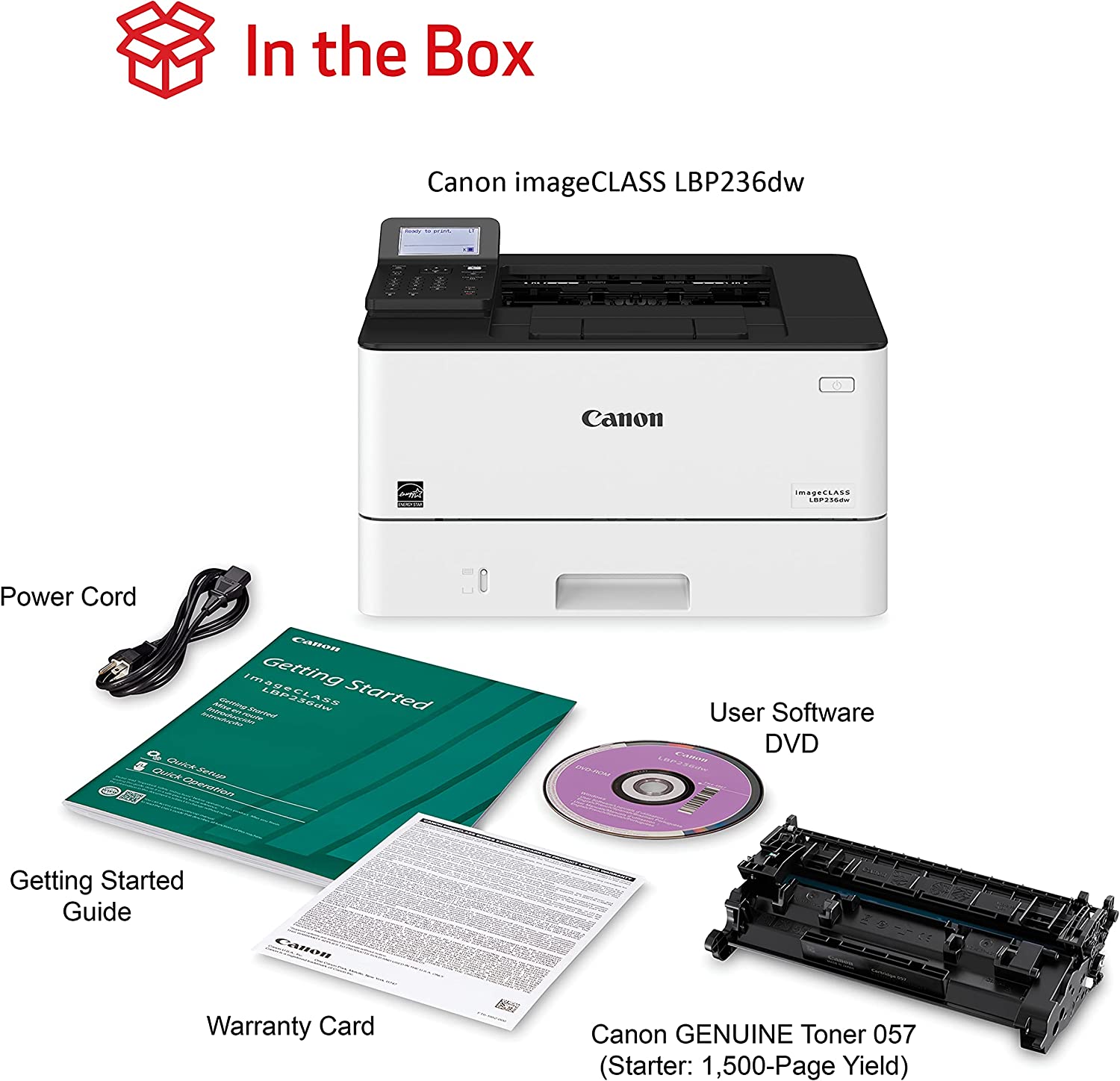 Key Features: Canon imageCLASS LBP236dw – Wireless, 40ppm, Duplex, Mobile-Ready Laser Printer – White. Print up to 40 ppm. Print up to 8.5″ x 14″. 900-sheet maximum paper capacity. Standard one-year limited warranty standard. Environmentally concious settings help save paper and energy. Print resolution of up to 1200 x 1200 dpi Warm-up time of approx. 14 seconds or less from power on First-print-out time of approx. 5.5 seconds or less Supports UFRII, PCL 5e, PCL6, and Adobe PostScript3 printer languages 250-sheet cassette, 100-sheet multi-purpose tray, and optional 550-sheet cassette for a maximum paper input capacity of up to 900 sheets Supports various media types and sizes, including plain paper, recycled paper, heavy paper, thin paper, colour paper, coated paper, label, post card, envelope, etc. Automatic double-sided printing USB 2.0 Hi-Speed, 10BASE-T/100BASE-TX/1000Base-T, Wireless 802.11b/g/n, and Wireless Direct Connection interfaces Compatible with Windows® 11 / Windows® 10 / Windows® 8.1 / Server® 2022 Mac OS X version 10.11 & up Linux Supports various network protocols and security features for print management and data protection Remote User Interface (RUI), Department ID Management, Toner Status Tool, iW Enterprise Management Console, and eMaintenance for easy device monitoring and maintenance Uses Canon Genuine Toner 057 Black (yields 3,100 Pages) and 057 High Capacity Black (yields 10,000 Pages), ISO/IEC standard