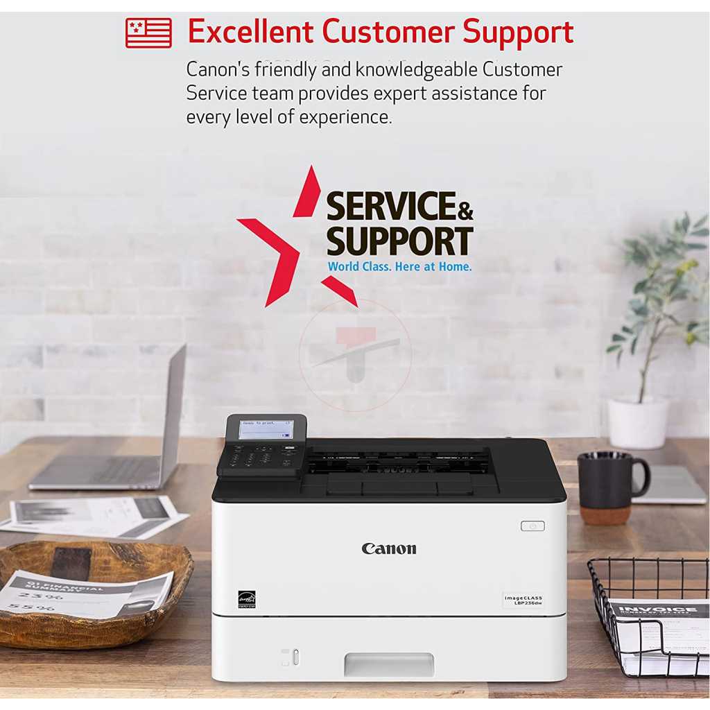 Canon imageCLASS LBP236dw – Wireless, 40ppm, Duplex, Mobile-Ready Laser Printer – White. If you are looking for a fast and reliable monochrome laser printer for your small business needs, look no further than the Canon LBP 236DW. This printer offers speedy performance, minimal maintenance, and the ability to add an optional paper tray for increased productivity. The Canon LBP 236DW can print up to 38 pages per minute (A4) and up to 63.1 pages per minute (A5-Landscape) with a print resolution of up to 1200 x 1200 dpi. It has a warm-up time of approx. 14 seconds or less from power on and a first-print-out time of approx. 5.5 seconds or less, so you can start printing without delay. It supports various printer languages such as UFRII, PCL 5e, PCL6, and Adobe PostScript3 for enhanced compatibility and performance. The Canon LBP 236DW has a standard paper input capacity of 350 sheets (250-sheet cassette and 100-sheet multi-purpose tray) and an optional paper input capacity of 550 sheets (optional cassette) for a maximum paper input capacity of up to 900 sheets. You can print on various media types and sizes such as plain paper, recycled paper, heavy paper, thin paper, colour paper, coated paper, label, post card, envelope, etc., with a print margin of 5 mm on all sides. You can also save paper and reduce waste with the automatic double-sided printing feature. The Canon LBP 236DW offers various connectivity options such as USB 2.0 Hi-Speed, wired network (10BASE-T/100BASE-TX/1000Base-T), wireless network (802.11b/g/n), and wireless direct connection. You can print from your PC or laptop using the USB or network interface or print from your mobile devices using the wireless connection. You can also use the AirPrint, Canon PRINT Business app, Mopria certified app, Canon Print Service Plug-in app for iOS and Android devices to print wirelessly. The Canon LBP 236DW supports various network protocols and security features for print management and data protection. You can use the TCP/IP protocol for print functions such as LPD/Port9100/IPP/IPPS/WSD and the SNMPv1/v3 protocol for management functions such as device status monitoring and configuration. You can also use the TLS1.3/IPSec/IP/Mac address filtering/IEEE802.1X/SNMPv3/SSL protocols for security functions such as data encryption/authentication/integrity verification/access control. For wireless security functions such as WEP/WPA-PSK/WPA2-PSK