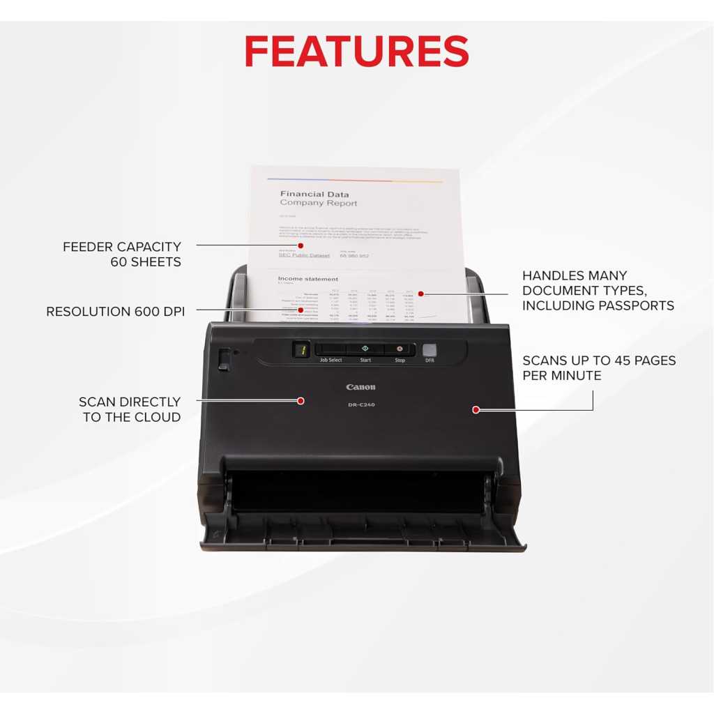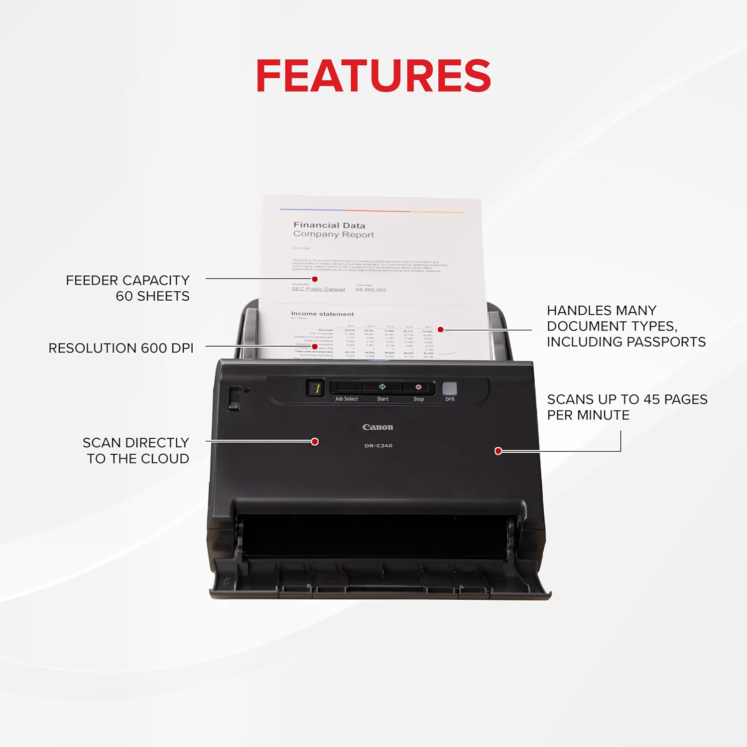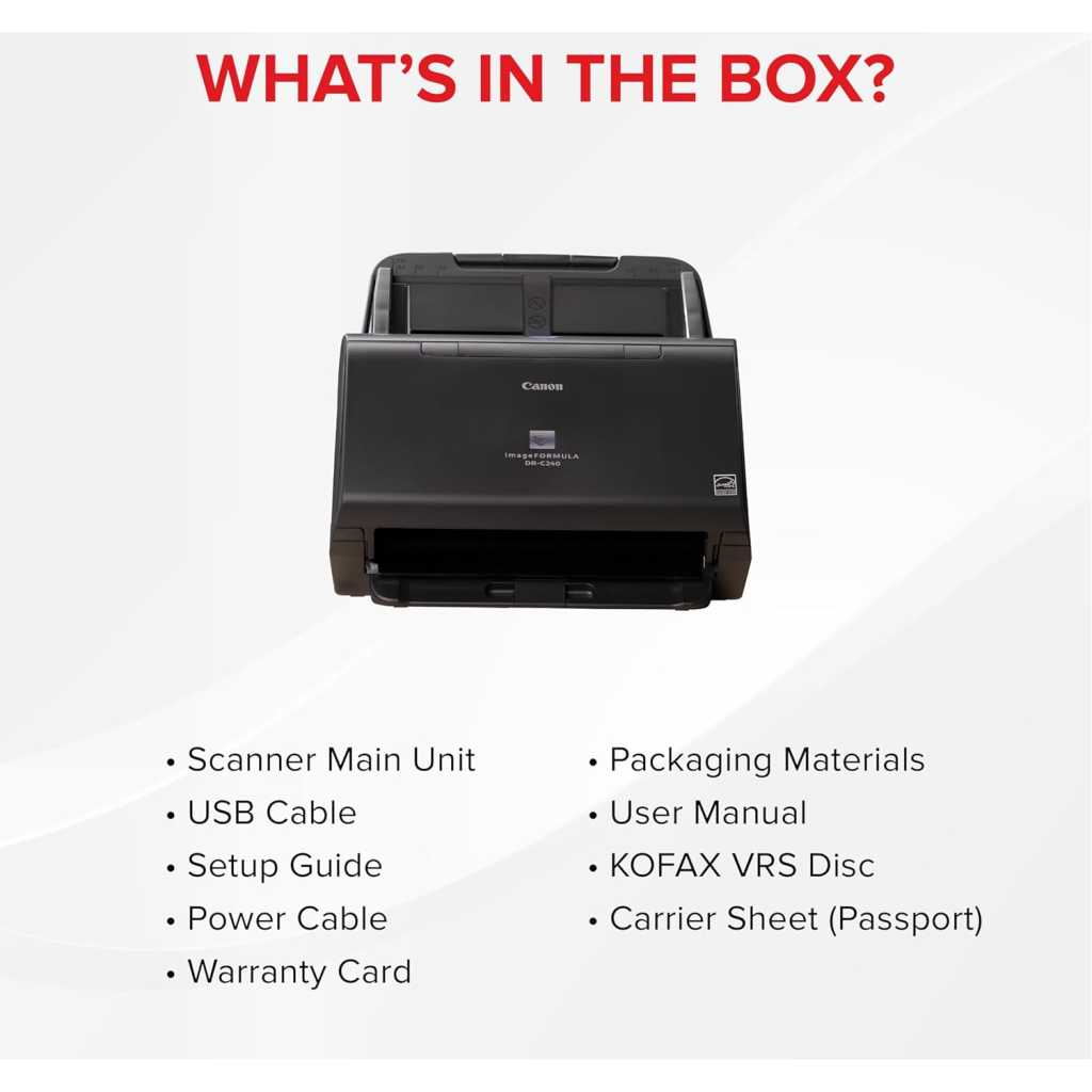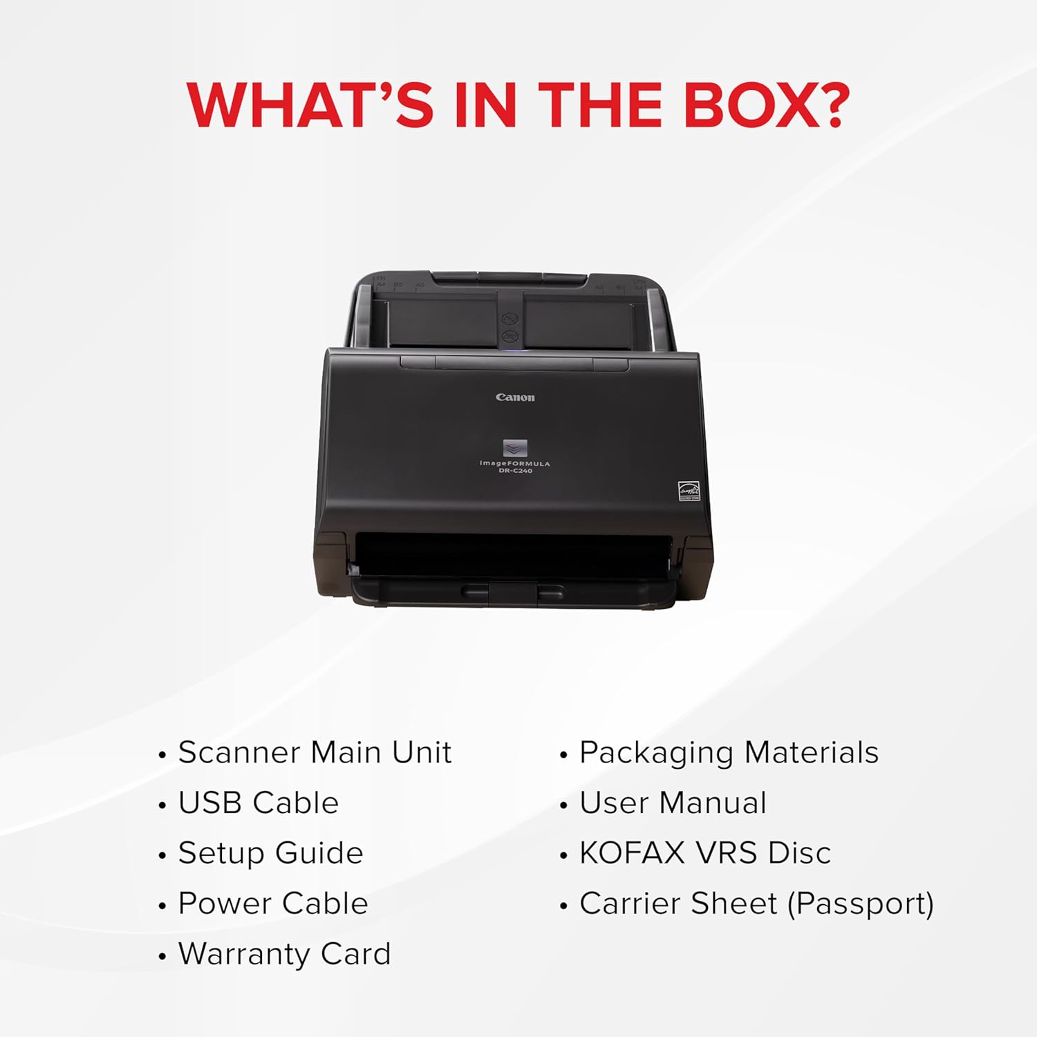 imageFORMULA DR-C240 Benefits Boost productivity with fast 2-sided scanning at up to 90ipm Easily scan various types of documents including passports with one compact device Enjoy peace of mind with supreme paper-handling reliability and durable construction Enhance your environment with quiet operation, compact build and elegant design Key Features: Boost productivity with fast 2-sided scanning at up to 90ipm Easily scan various types of documents including passports with one compact device Enjoy peace of mind with supreme paper-handling reliability and durable construction Enhance your environment with quiet operation, compact build and elegant design