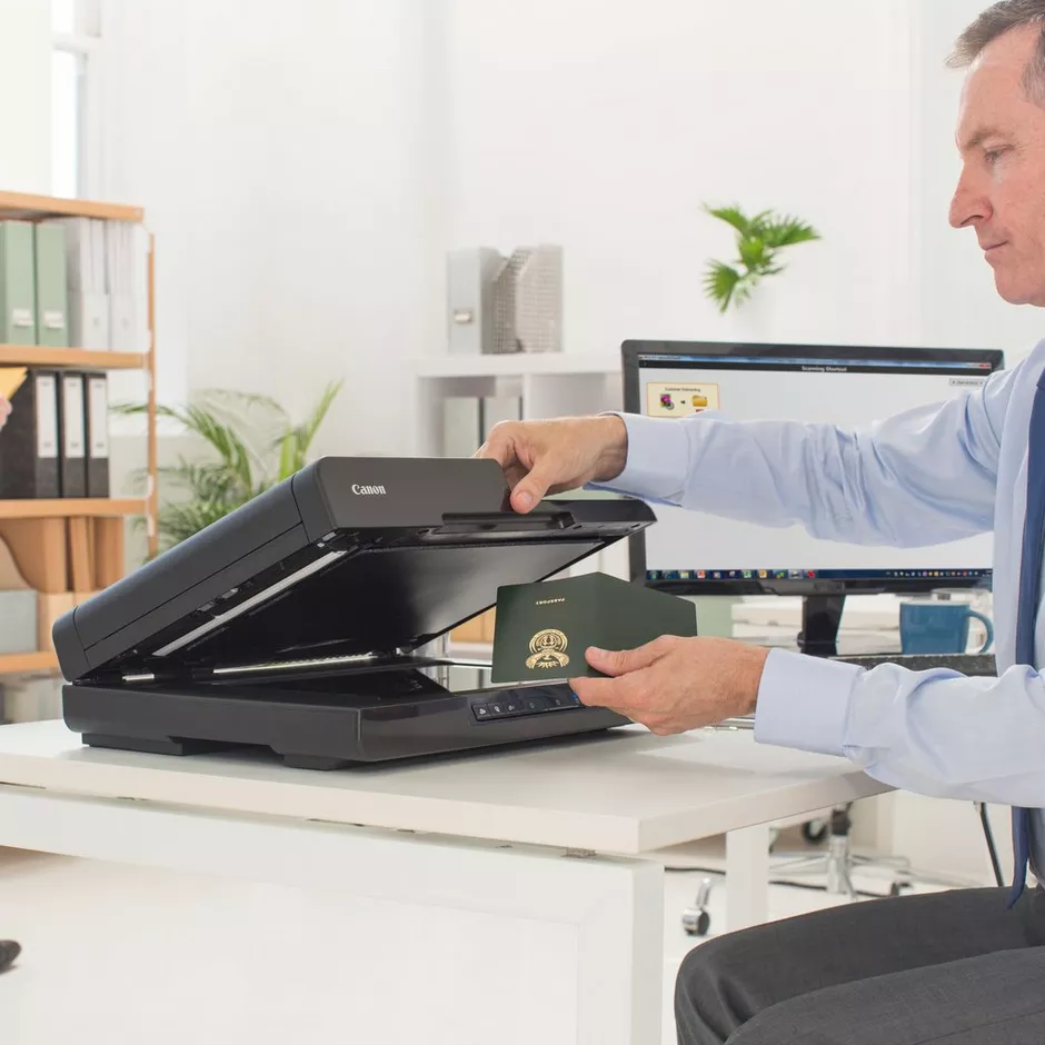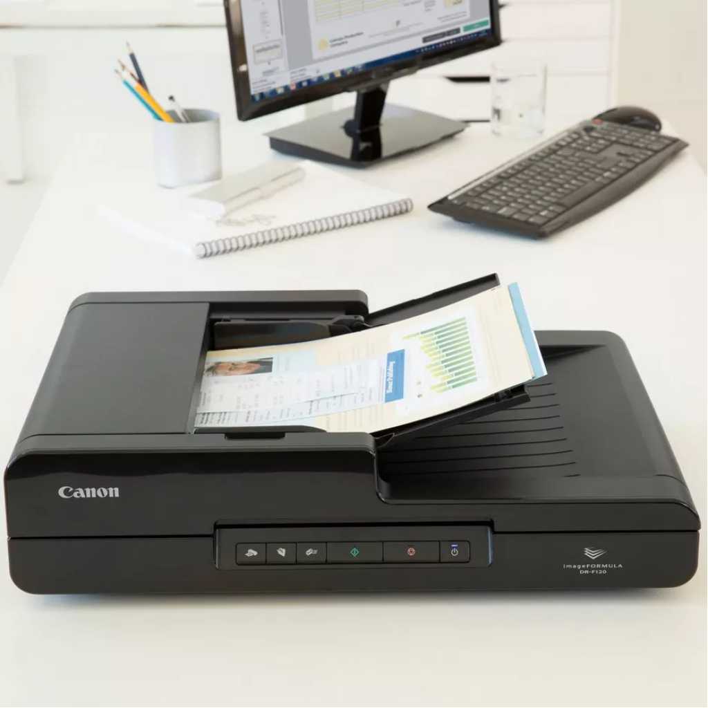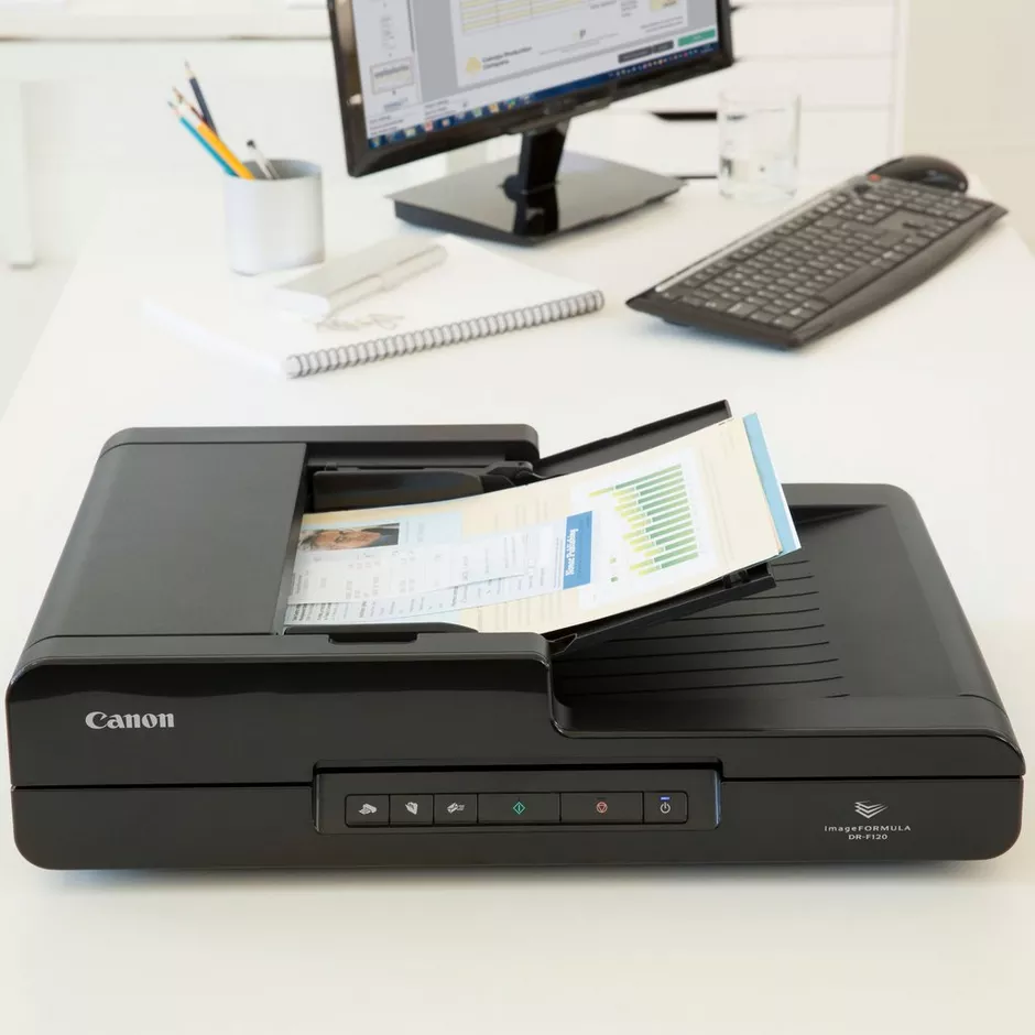 Capture various types of document types accurately and efficiently with the DR-F120: a compact all-in-one scanning solution that offers both an automatic document feeder (ADF) and flatbed. You can save yourself valuable time using the 50-sheet automatic document feeder, with its faster 20 ppm or 36 ipm scanning speeds¹. The DR-F120 can be relied on to get through your work with a suggested daily volume of up to 1500 scans. The DR-F120 delivers superior quality results time after time due to a wide range of built-in image enhancement features and Canon’s renowned imaging technology. Specifications Key Features: CANON SCANNER: Canon imageFORMULA DR-F120 is a flatbed document scanner with ADF that is ideal for versatile scanning in the home or office – scan batches of standard documents, and then with integrated flatbed books, passports, magazines or fragile materials FAST: Double sided scanning up to 20 sheets per minute thanks to the ADF feeder, and large 50 sheet document feeder (ADF) CONNECTIVITY: With Canon’s CaptureOnTouch software, scan and convert your documents to multiple formats, use OCR, and save documents to your favourite cloud applications – such as OneDrive, Dropbox, Google Drive and SharePoint IMAGE QUALITY: Expect superior quality results time after time with wide range of image enhancement features , and supporting up 2400dpi resolution with Flatbed. Automatically detect paper size and text orientation; while the automatic deskew feature straightens documents fed at an angle CANON: Canon scanners are the perfect desk accessories for your home or small office – delivering superior quality results time after time with Canon’s renowned reliability and imaging technology