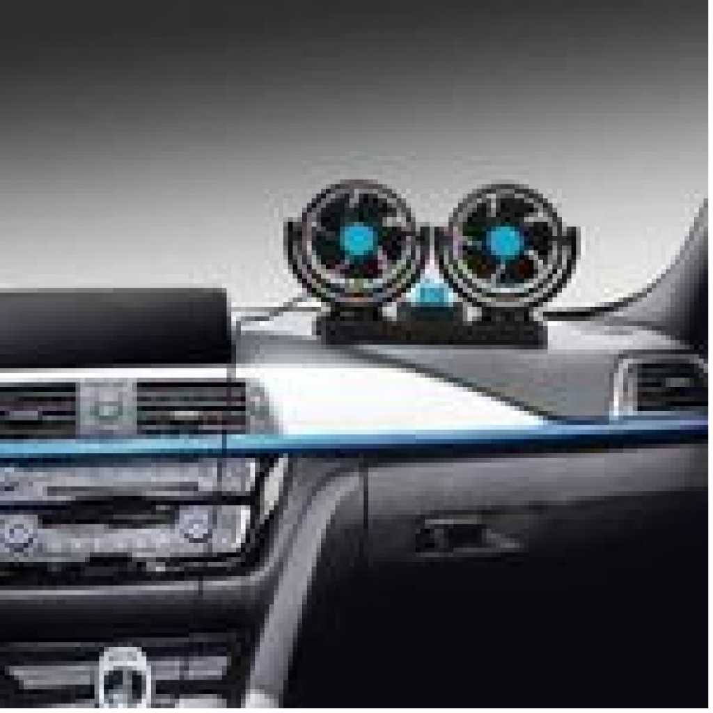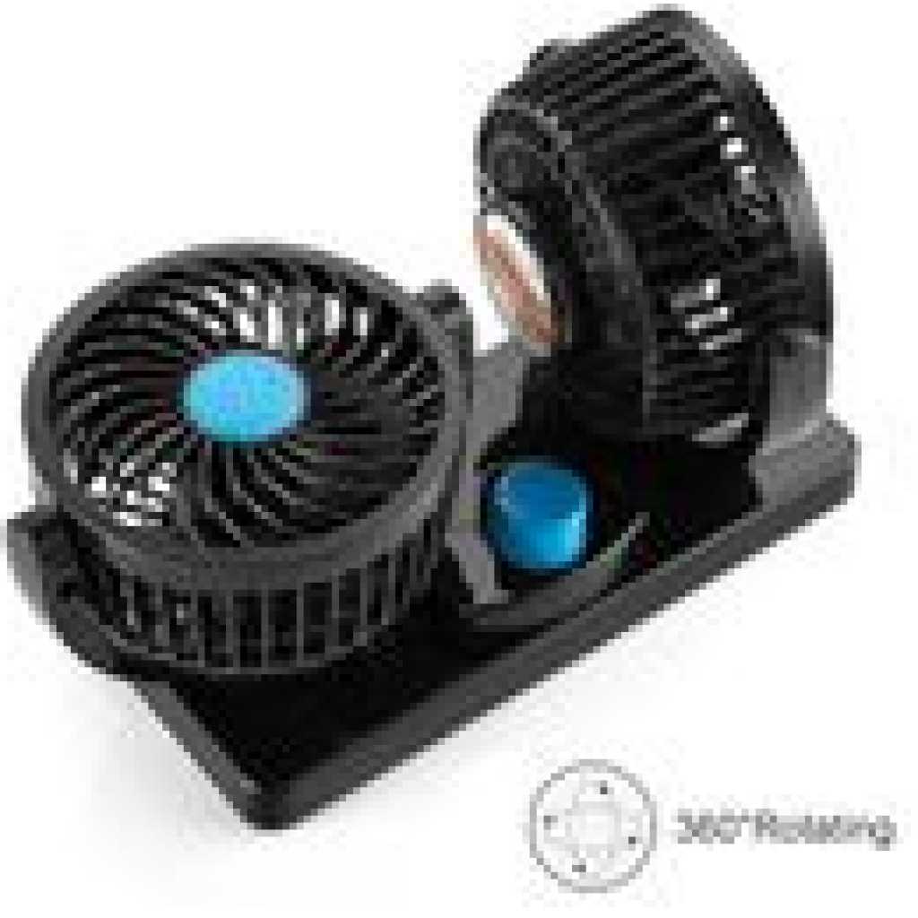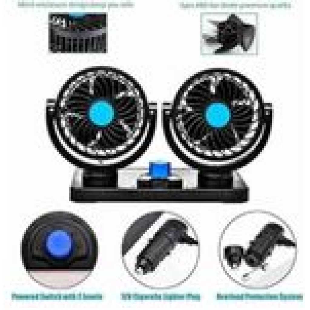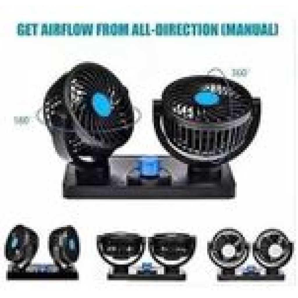 HIGH QUALITY & COOLING: 12V DC fan with dual 4 inch head fan,blow hot air out of your car, blows a cooling breeze to the driver and passenger,also remove any smells and defrosts your windshield effectively and remove moisture off of interior windshield on cold rainy days 2 SPEED CONTROL & 360 DEGREE ROTATION: Dual heads auto fans with 2 speeds,360 degree rotation for the 2 swivel fan heads to cool your the entire vehicle;it can also help the car A/C cool down quicker and more efficient, and spread a cooling air 2 ADHESIVE STICKERS:Strong wind with adhesive base to secure the fan to dashboard or arm rest area;Fans in small size will not cause visual blind spot when attached to your dashboard LOW ENERGY CONSUMPTION & LOW NOISE: With small power,8-15W low energy consumption ,the car can save more electricity and petrol; Motor Come with High Quality Cooper ,providing low noise but strong wind APPLICATION: FITS All Vehicles with 12V Lighter Socket(4.5 Feet Cable is long enough to place the fans on back seat, or use outdoor); Kind Note: you can use our fan at home, very convenient and comfortable if you have an AC to DC adapter