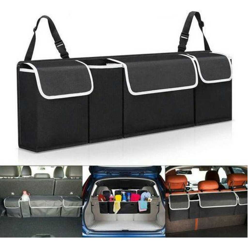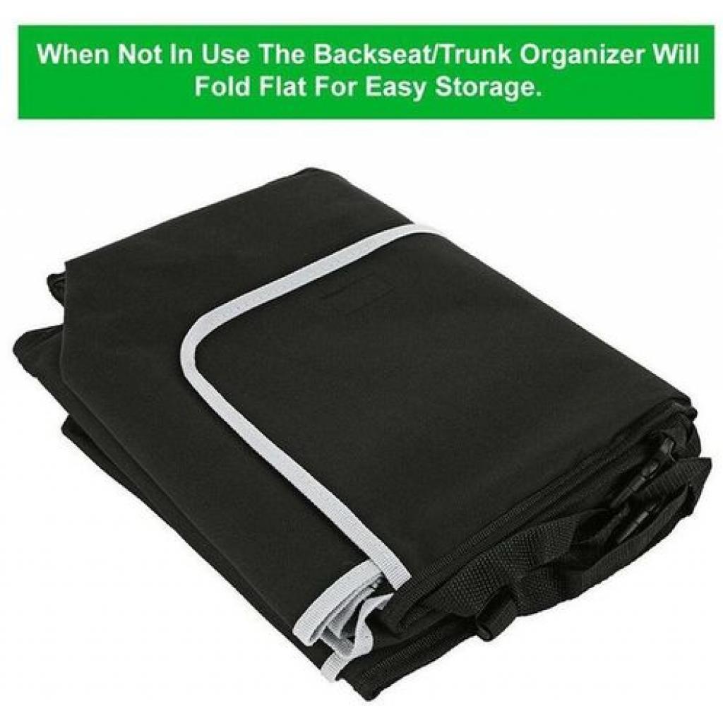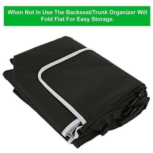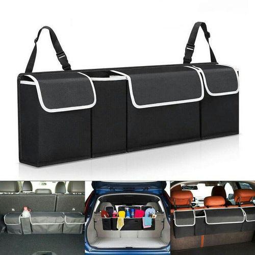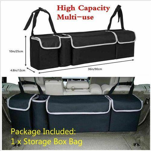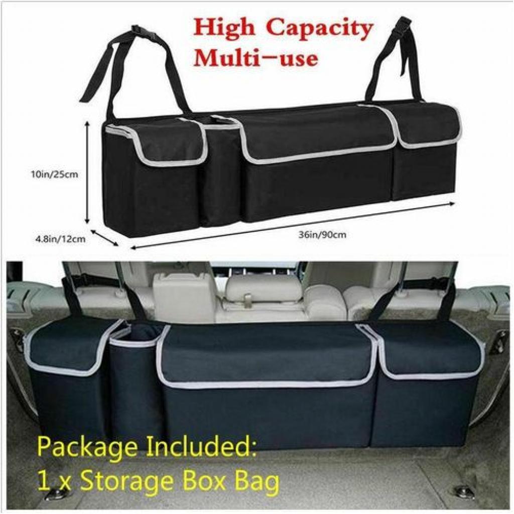 2 in 1 functionality – Can easily be used as a backseat car organizer or a car trunk organizer! There are 4 spacious pockets and lid with fasteners. You can put your favorite things in your pocket. Fully adjustable headrest straps – suitable for all vehicles. Solid backboard and front center pocket – Maintains rigidity even when under load. Multipurpose – Car storage for kids toys, vehicle spares, snacks, pet toys, baby supplies, cycling gear, soccer equipment and even a golf trunk organizer. Proven companion for any successful camping or fishing trip. Keep the tent pegs, fishing tackle and marshmallows safely suspended above your trunk. Specification: Condition: 100% brand new high quality Product Name: Car Storage Box Bag Color: black Material: 600D encryption waterproof Oxford cloth Product Size: 90 cm x 25 cm x 12 cm Package Included:1 x Storage Box Bag Product type: Rear Racks & Accessories Key Features: Collapsible organizer 4 separate pockets Soft material Ideal for groceries or auto accessories Two carrying handles Dimensions: 50cm x 32.5cm x 32.5cm