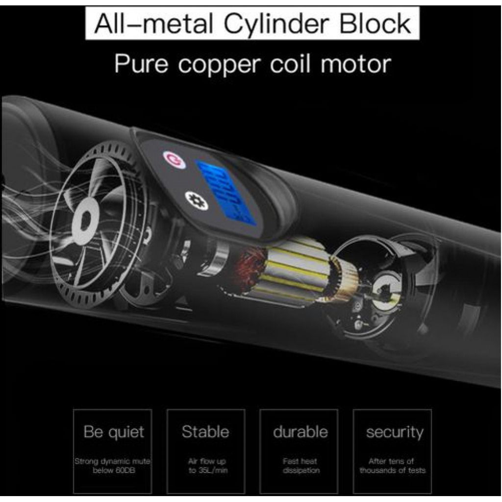 Key Features: SLEEK – Unlike any tire inflator you?ve seen before is a sleek and clear shaped cylinder. It is the first tire inflator that got rid of all physical buttons and features a 0.91in, 128*32 resolution OLED display with capacitive touch. Even when you don’t need to inflate your tires, you can connect to them at any time to gauge the tire pressure. The screen shows your current pressure immediately when connected like the picture shows above. SMART – The built-in microcomputer manages the whole system meticulously. It instantly measures the tire pressure when connected to a tire, automatically stops when it hits the preset tire pressure,monitors internal temperature real time and regulates the cooling fan accordingly. EASY TO USE – Minimalism isn?t just a design language shown in the exterior design but a philosophy that sips into very corner of our professional life and very detail of our products. has only 4 touch buttons, one Power key, one Start/Pause key and a pair of +/- keys to set pressure values. It?s so simple that you won?t even need a manual to operate it. POWERFUL – small and cool, both figuratively and literally, doesn?t mean it has to compromise in performance. We utilize a top notch high intensity ferromagnet 380 motor that is small in size but fast in operation, 30,000 rpm, and big in power output, 56w to be specific. The whole system produces 18kg of torque, enabling to produce 12bar/1.2Mpa/174psi of air pressure and pump 10-17 Liters of air per minute. QUIET – All the high manganese steel gears are precisely regulated to realize dynamic equilibrium, and the whole device is very tightly sealed, making it significantly quieter than a regular tire inflator.