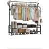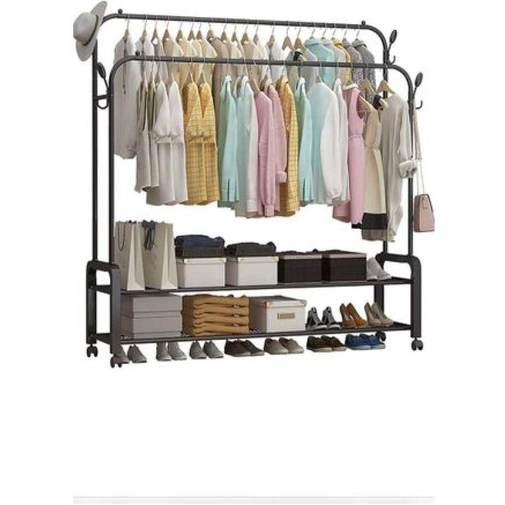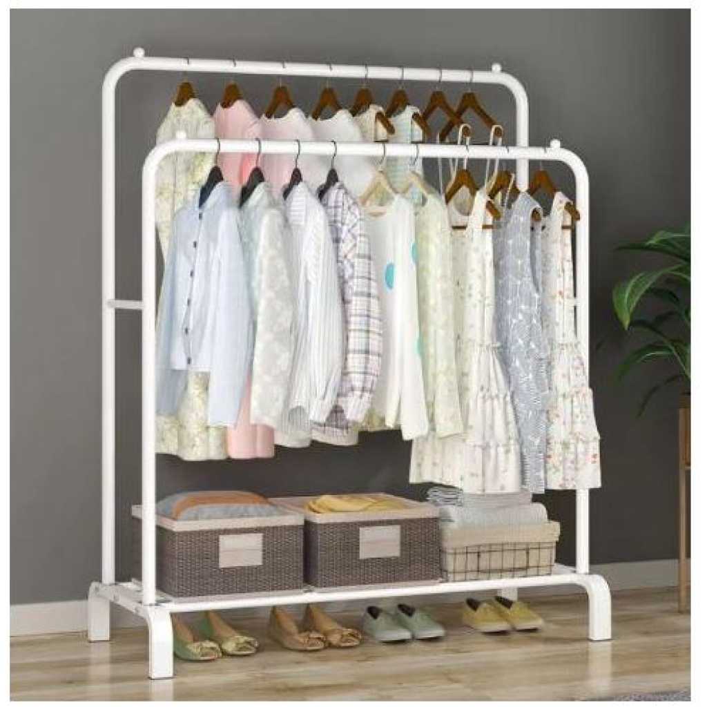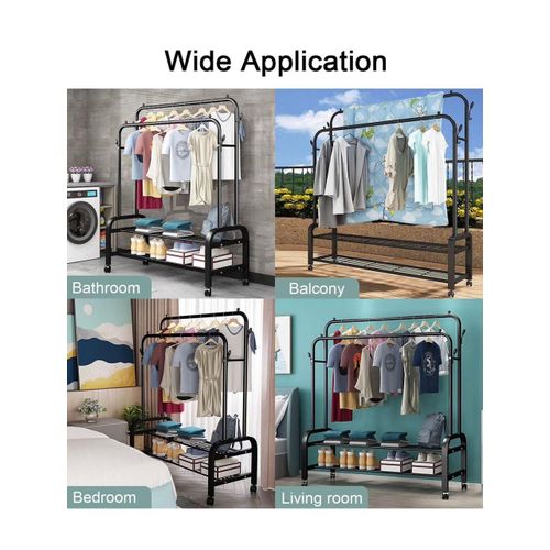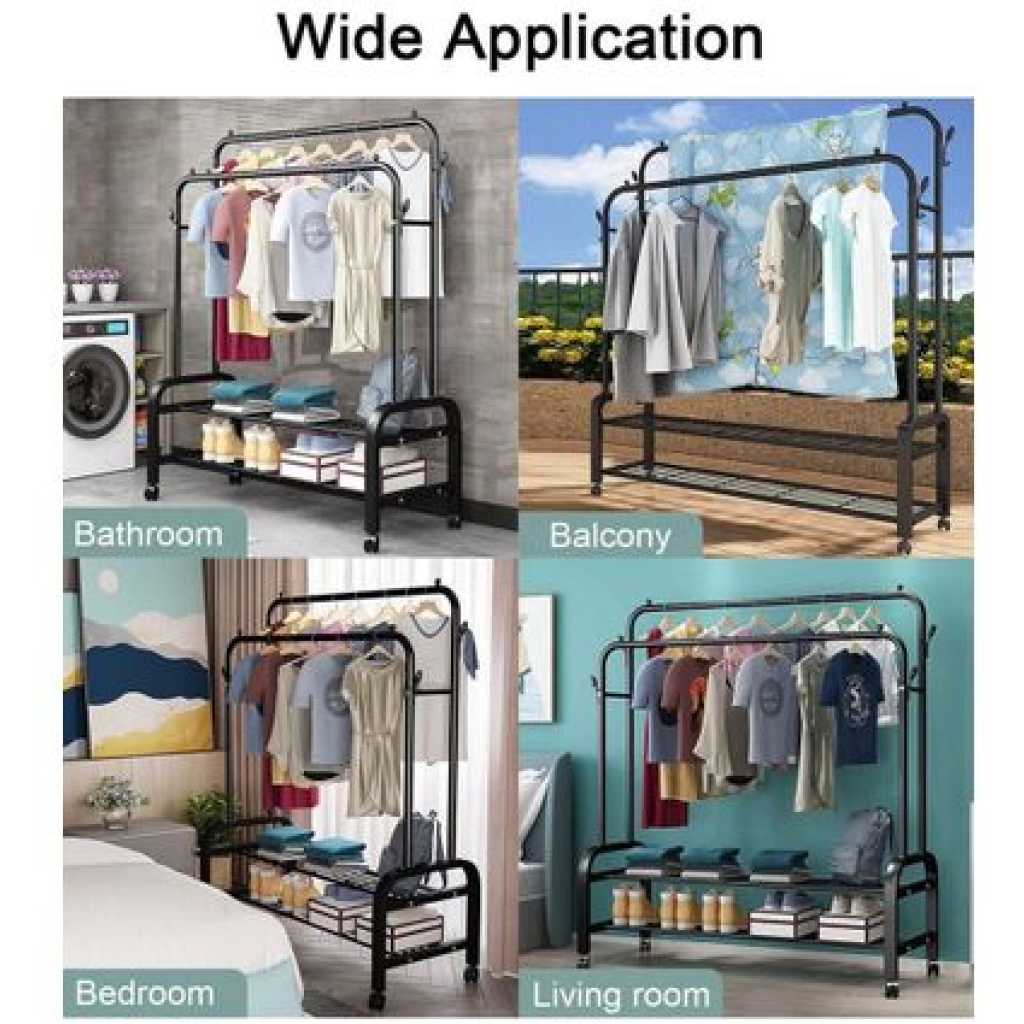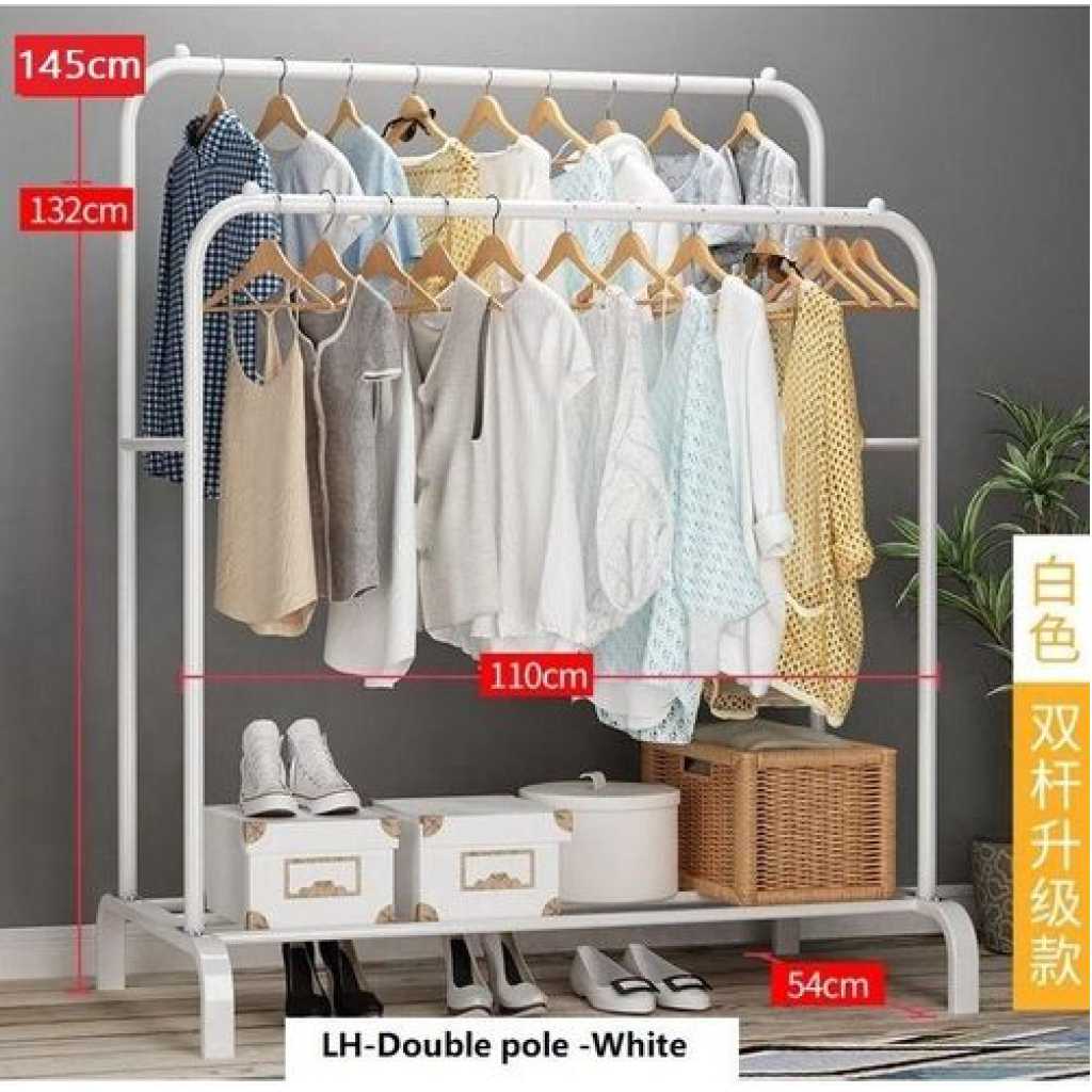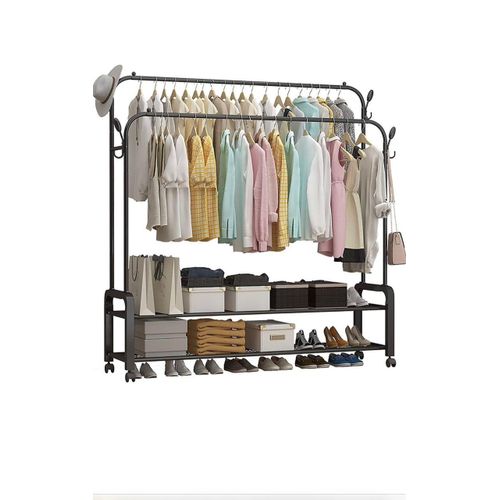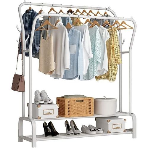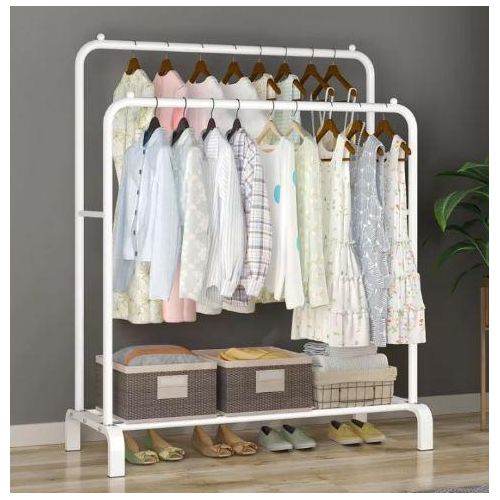 Carbon Steel Double Pole Coat Rack Indoor Bedroom Clothes drying Rail Balcony Hanging Clothes Shoes Rack Standing Storage Organizer With Hooks- Multicolor Are you looking for a rack to put away your clothes, shoes, and bags? Try a new garment rack! Advantages: -The rack offers you enough room to put away your garments. Shoes and boxes can be put on the lower two shelves while the hooks on the side can be used to hang hats and coats. -Thickened steel pipe makes the rack more sturdy and ensures that the rack can withstand more weight. -Non-slip foot pads make the rack more sturdy and also can protect the floor from being scratched. -Easy to assemble and disassemble. Size: 66/110/135/150cm Features: ✅Hang your daily clothes and make your space organized. ✅Resistant to aging, floor protection, and easy to move. ✅Prevent clothes from slipping, design is more user-friendly. ✅Can be used anywhere in your home, like the bathroom and under covered balconies. Key Features: Carbon Steel Double Pole Coat Rack Indoor Bedroom Clothes drying Rail Balcony Hanging Clothes Shoes Rack Standing Storage Organizer With Hooks- Multicolor This coat rack takes up minimal space in foyers, living rooms, office workspace, and doctors’ offices keeps coats and accessories out of cramped closets, and is easily accessible with hooks all around the rack. Increase the base, the load-bearing is larger and can bear 50kg. The shape is unique, the hanging clothes will not sway, and the stability is super strong. Reasonable partitioning, larger capacity. Applicable occasions: living room, study, bedroom, entrance, balcony, etc.