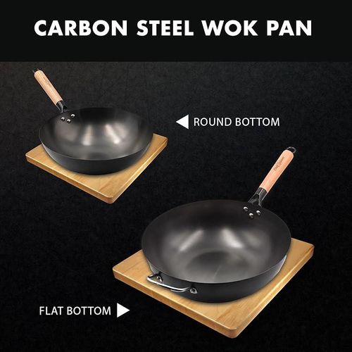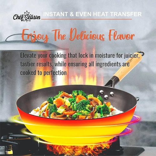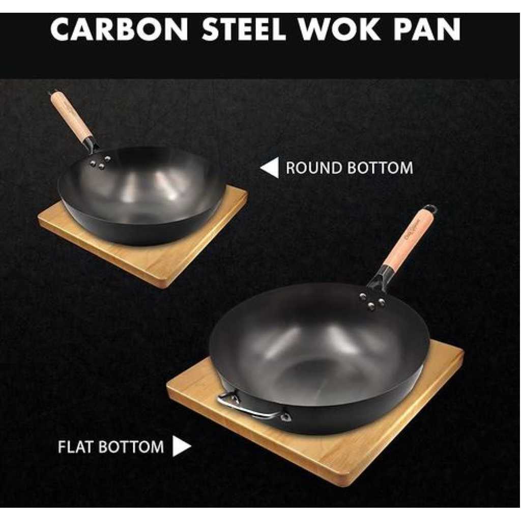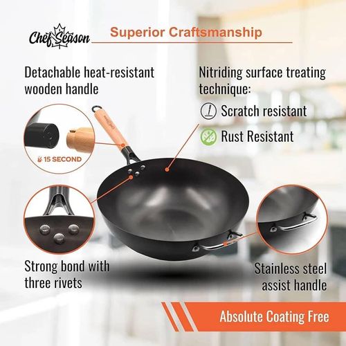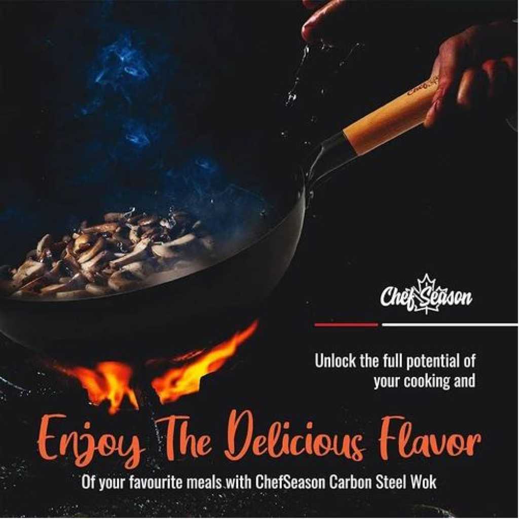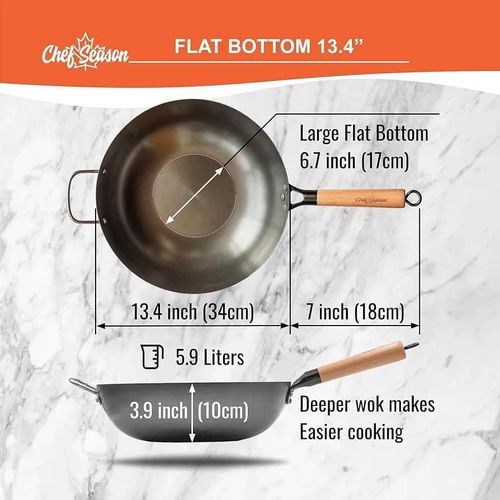 Carbon Steel Wok Flat Bottom, which is made with love and gratitude! ChefSeason Carbon steel stir fry wok pan is designed for both professional chefs as well as for every home use. Its large-sized flat bottom allows the wok works perfectly with all types of cook tops. from Induction stove, glass cooktop, and electric range, to gas cooktop and even open campfire. The Chefseason wok carbon steel preseasoned performs just sturdy and matches all these situations. the smooth bottom exterior can minimize the chance of getting the glass cooktop scratched and bring such ease in cleaning. Through the precise manufacturing process, each induction wok pan is made to its ideal shape. Only those who can successfully pass the complicated surface enhancement and the polish process can be qualified to push to the marketplace! WHY CHOOSE THIS MAGNIFICENT CARBON STEEL FLAT BOTTOM WOK? Superior quality carbon steel stir fry pan nonstick Expertly crafted Skillfully nitrogen treated at over 1000F high temperature Non-stick and rust proof Scratch-resistant and corrosion-resistant surface Brings comfort and class Comes pre-seasoned Sturdy, thick and durable Safe, non-toxic and 100% PFOA-free Extremely lightweight at only 3.5 lbs Heats up quickly Allows rapid and even heat transfer Ideal size for most families Comes with a detachable wooden handle Versatile usage Easy and hassle-free maintenance Wonderful Gift NON STICK & RUST RESISTANT– Chefseason wok brings comfort, cook conveniently. This stir fry pan is expertly nitrogen treated at over 1000F high temperature to make this nonstick wok scratch-resistant, corrosion-resistant and easy-to-clean, so you can cook healthier meals with less oil and more flavour effortlessly with this cooking wok! SUPERIOR QUALITY – Chefseason steel wok is a large wok meticulously constructed using heavy-gauge premium professional grade wok carbon steel and skillfully pre-seasoned, our carbon steel wok pan is safe, sturdy, 100% Coating-free and safe for health, extremely lightweight at only 3.5 lbs yet durable enough to endure the wear and tear of everyday use for years to come! ENERGY EFFICIENT – This carbon steel wok pan flat bottom has a large wok flat bottom design and exquisitely designed wall curves, this wok pans has a better touch of heat source, heats up quickly, allows rapid and even heat transfer for perfect results in every meal, locks juices and flavours within ingredients, and delivers authentic flavours. Ideal sized steel woks for most of the family sizes! ADAPTIVE & VERSATILE – Our stir fry wok comes with a detachable wooden handle that can be removed or reinforced to this pow wok with ease via 3 included solid rivets. this Chinese wok has good heat insulation properties, stays cool, keeps your hands safe and offers a firm, comfy grip for versatile cooking jobs: stir-frying, pan-frying, braising and deep-frying, works with gas, electric, induction and ceramic glass cooktops! HASSLE-FREE MAINTENANCE – ChefSeason carbon steel cooking pans are pre-seasoned professional wok yet still require cleaning and seasoning with oil on first use. All you need to do is wash the non stick wok pan clean, dry with low heat, oil the whole interior surface, and you are all good! Moreover, this flat bottom carbon steel wok comes with a free tote bag for grocery shopping