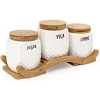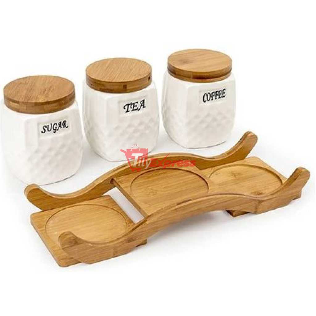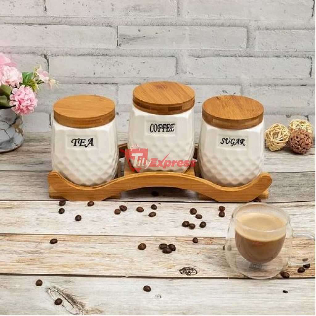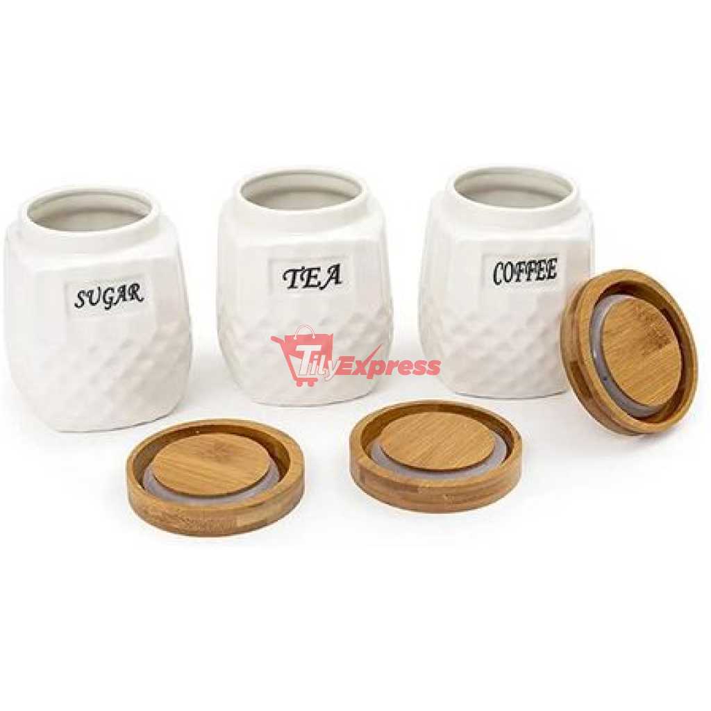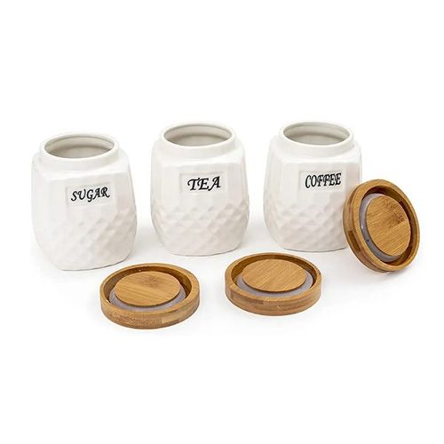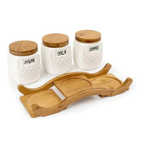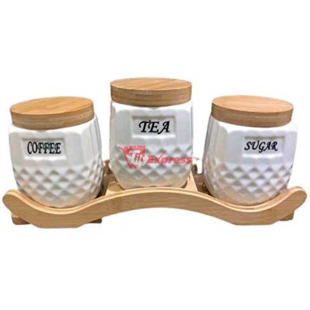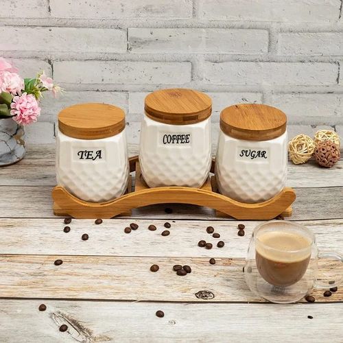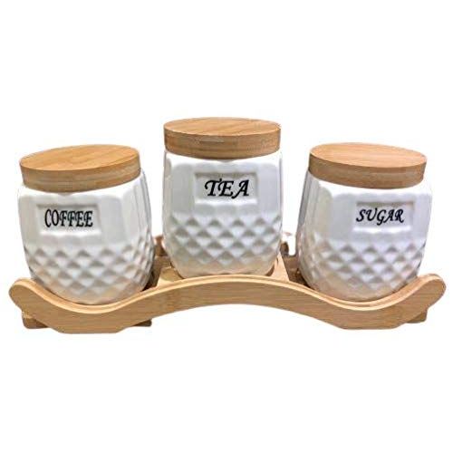 Key Features: Ceramic Trime Tea Coffee Sugar 3 Canisters Set With Wooden Wavey Stand Tray & Bamboo Lid Condiment Airtight Jars Set- White. Tea Coffee Sugar sets ceramic jars Bamboo wooden airtight lids The bamboo base for easy storage Eco-friendly bamboo wooden bridge design Durable modern raised novelty design Hand wash recommended.