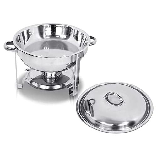 Chafing Dish Round Chafer Buffet Catering Warmer Food And Water Pan, Lid, Solid Stand, And Fuel Holder. Features stainless steel, with a mirror-polish finish for a unique look, this SUPER DEAL chafer is designed for everyday use at your finest catered events. Use it to create a beautiful buffet setting without breaking the bank. Plus, whether you’re serving up a delectable egg bake or your signature side dish, this chafer will present it in style. Durable Construction A durable stainless steel construction ensures this chafer is built to withstand everyday use, while providing a timeless appearance that blends in with your classic decor. Mirror Finish Each chafer features a highly-polished mirror finish that will shimmer in the ambient lighting of your venue. With its high quality finish, this chafer will add to the presentation value of any of the sides or entrees that you are serving! Sturdy Handles A sturdy handle on the cover makes for efficient service, while two handles on the chafer stand ensure easy transport. Broad Legs For optimum stability, a total of three broad, evenly-spaced legs keep the chafer sturdy on your buffet line. Elevated Fuel Stand The fuel stand is positioned close to the water pan. This helps maintain your food’s serving temperature for hours. Specifications: Overall Size: About 16.5” x 13.5” x 11.4”(L X W X H) Alcohol Furnace Size: 3.5″ D X2.4″ H Material: Stainless Steel Volume: 5 Quart