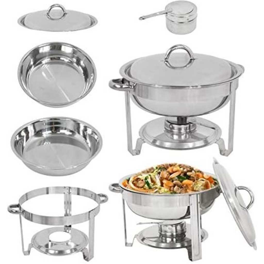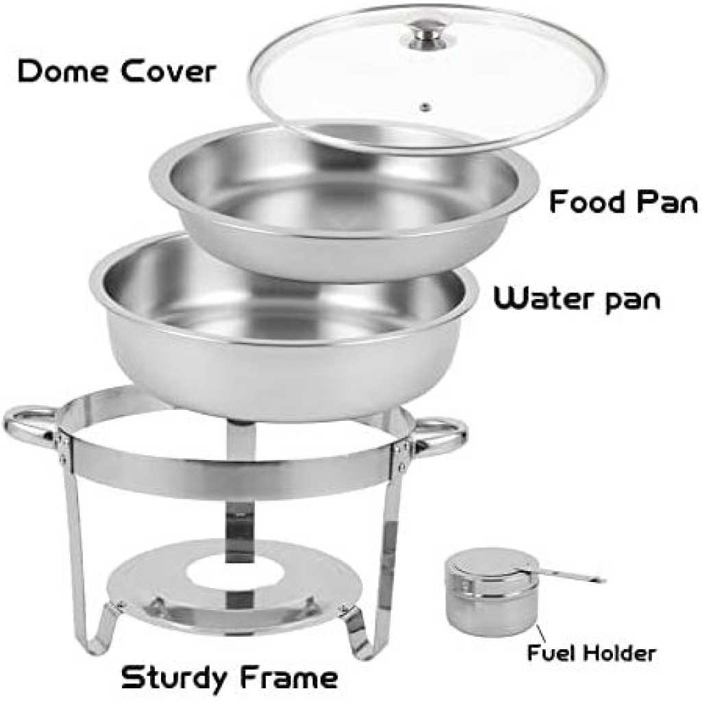 Key Features: Chafing Dish Round Chafer Buffet Catering Warmer Food And Water Pan, Lid, Solid Stand, And Fuel Holder. Durable Construction – Made completely out of corrosion-resistant 18/8 stainless steel, the stainless steel is a heavy commercial grade, yet it is still lightweight to lift, this chafer is built to withstand the demands of your catering outfit or buffet line. With durable stainless steel construction, its elegant and spacious design adds long-lasting serving functionality and sleek style to any party or catering event. Even Heat Distribution – Maintains proper food temperature for the best cuisine with this heavy-duty 5-quart buffet chafer. Place your heat source in the fuel holder, install and fill the lower pan with water to evenly distribute heat, and place your food in the upper pan. This durable stainless steel chafing dish maintains foods at just the right temperature and can keep food hot or cold for hours. Considerable Details – Features a heavy-duty stand to provide stability. The elevated shelf positions heat close to the water pan, maintaining your food’s perfect serving temperature for hours. This elevation also minimizes exposure to the flame, ensuring guest’s and staff’s safety. One of the biggest advantages of this chafer is that you can serve directly from the oven or stovetop using the wide stainless steel handles for easily transporting the dish. One Complete Kit – Complete with a water pan, food pan, cover, and fuel holders, this chafer has everything you need to keep your hot food items warm throughout the entire length of your reception, banquet, or catered event. This chafer features a divided food pan for ultimate versatility and allows you to be served right away! The Perfect Addition – Get out of the kitchen and into the cooking spotlight. Stainless steel ensures superior strength. NEVER rust, tarnish or corrode. To draw your guests in, a mirror finish on the lid and body of this chafer beautifully picks up on and reflects out, your venue’s ambient lighting for a glamorous presentation.
