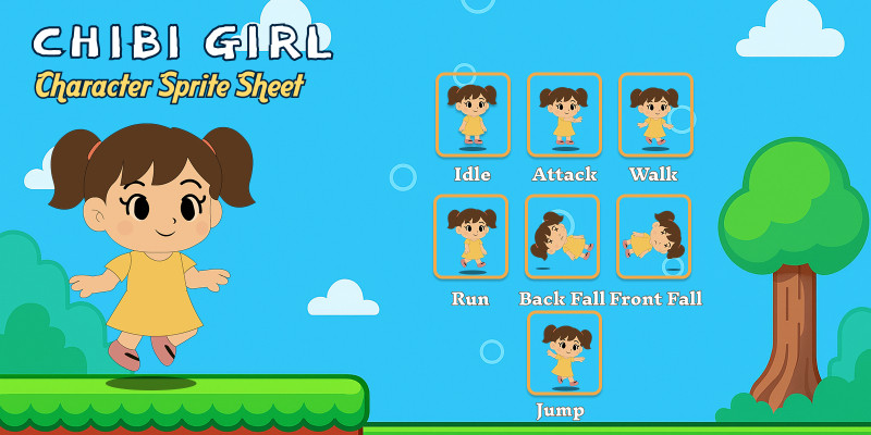 Character Sprite Chibi Cute Girl Character. Cute cartoon girl character with Walk, Jump, and Idle animations for 2D games.