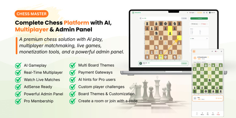 Chess Master - AI online multiplayer Chess Platfor. Complete online chess platform with AI gameplay, multiplayer matchmaking, friend challenges, live matches stream, Ai Hint