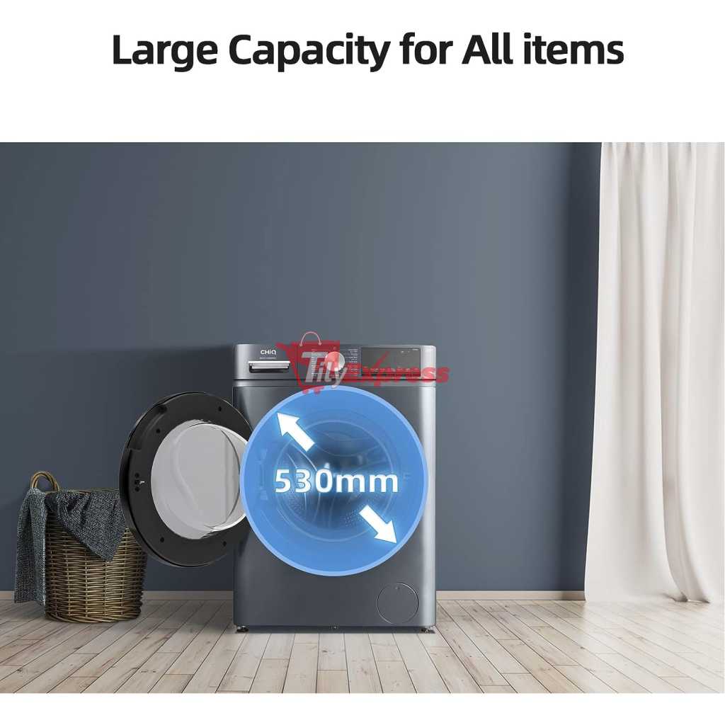 CHiQ 7 kg Front Load Washing Machine – CG70-14586BSK3, AI One touch with Quick wash Function, High Speed 1400 rpm, Counter Depth and Child lock, Inverter Motor, Silver. 7 kg for a family of 3 to 4 people Larger drum A drum for the whole family The diameter of the world class drum reaches 530 mm, which provides a large washing space, stronger beat of clothes and better washing performance. One Touch Wash Press a single key to start the smart wash mode, without the need for further operations. The One Touch wash cycle can intelligently detect the weight of the laundry and adjust the washing time and temperature to achieve intelligent washing. 15 types of washing programs For all types of ordinary fabrics 15 types of washing programs are predefined for all types of ordinary fabrics. Whether it’s light summer, winter clothing or white shirts, it can easily handle them all. In addition, the device is equipped with the “Mixing” function to automatically adjust the rotation, water temperature, water volume and easily make all the laundry. Quick wash 15 min Quick wash for 15 minutes to clean the smell of your clothes after physical exercise. Keep clothes clean with 2 quick rinses. Save time by finishing washing in 15 minutes. Automatic high temperature drum cleaning Keep washing machine clean Complete process of wetting, rinsing, soaking and removing dirt and bacteria from the inner and outer drum at high temperature. It can effectively clean and prevent bacteria to preserve a healthy washing environment. Electromagnetic door lock Mid-program clothing filling function, convenient and safe Electromagnetic door lock, open and stop for greater security. Add clothes while the program is in progress, every oversight can be properly resolved. *If the water level or the water temperature in the drum is too high, the door lock light is on, the door cannot open. Child safety. Keep your children safe Child safety. Prevents accidental change of washing cycles, especially when there are children at home. BLDC inverter motor + ECS system Energy saving and quiet operation Reduce operating vibration by correcting polarization at the right time. Quiet operation with low vibration. Low noise, energy saving. *Product images on product websites are provided for guidance only. The actual product (including but not limited to its appearance, color, dimensions, etc.) may vary. The actual product prevails. 1. The water inside the washing machine is the one used in the factory waterproofing test, which is normal. 2. Please do not put clothes and detergent on first use. Please initiate a full program to drain the test residual water into the machine. 3. Auto Shut-off: The CHiQ washing machine stops automatically after washing is complete. Memory in case of power failure: If a washing program is interrupted by a power failure, the program will continue automatically when the power is restored. 4. A specific water flow allows the door and mat to separately rinse the mat to remove foam residue from time to time, protect the mat from mold and keep the machine itself clean. 5. When the child safety feature is enabled, the other control keys are temporarily disabled to avoid any danger associated with child mishandling. 6. When the system detects that the laundry is too heavy to wash at a high speed, it automatically limits the speed to control it and reduce noise. In this case, the actual speed is less than the set speed, which is quite normal. 7. If you need to add laundry or adjust the washing program, check the water level and temperature in the drum before opening the door. Do not open the door if the water level in the drum overflows, you may get burned by this water. 8. Improper installation or use will produce abnormal vibration or noise. In this case, you should refer to the following solutions Before use, check if the 4 pads are stable and balanced, and if the transport bolts have been removed; Check if this is not due to very uneven distribution of the laundry in the drum and if so, redistribute the laundry to make the distribution even; check if the water level is not too low; Use of plastic pads and brackets, or fall of foreign bodies (such as coins and pins to hair) in the machine also generate noise; In the case of a small load of clothes to wash, it is recommended to lower the dehydration rotation to 500 or 700 RPM.