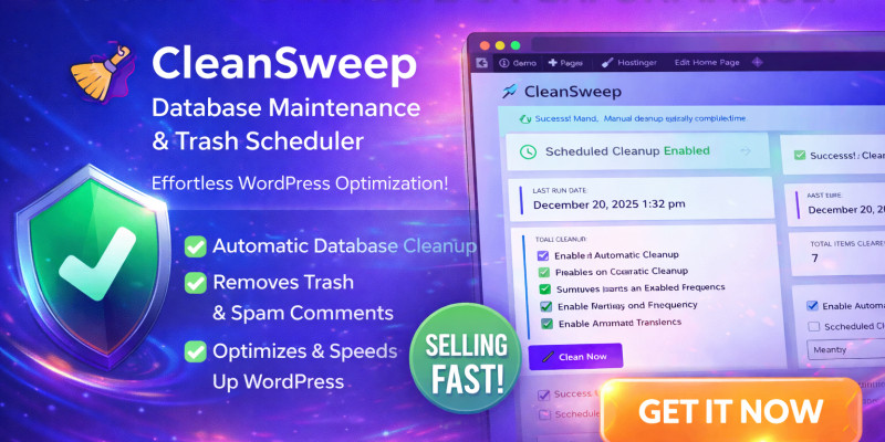 CleanSweep – Database Maintenance WP Plugin. Automatically clean trash, spam comments, and expired transients with manual & scheduled database maintenance.