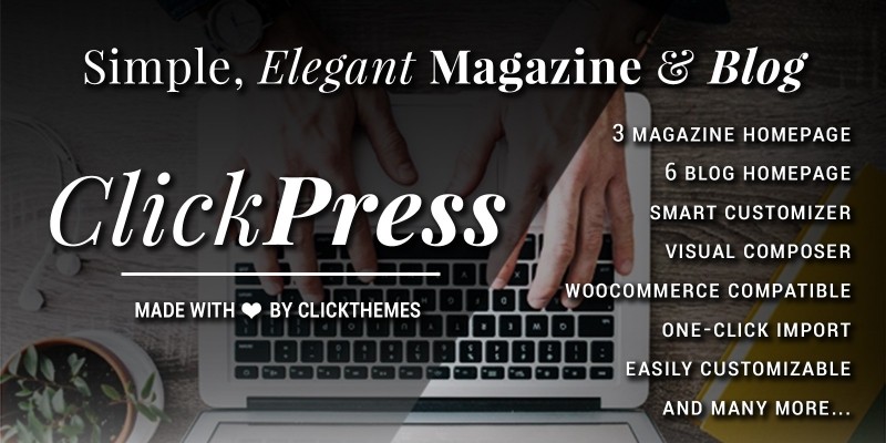Click Press - Magazine WordPress Theme. Click Press is a Wordpress theme for magazines, blogs, writers, personal sites and store.