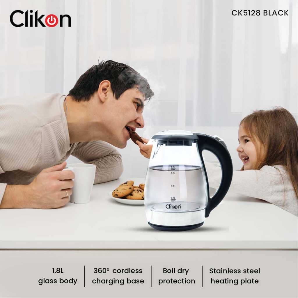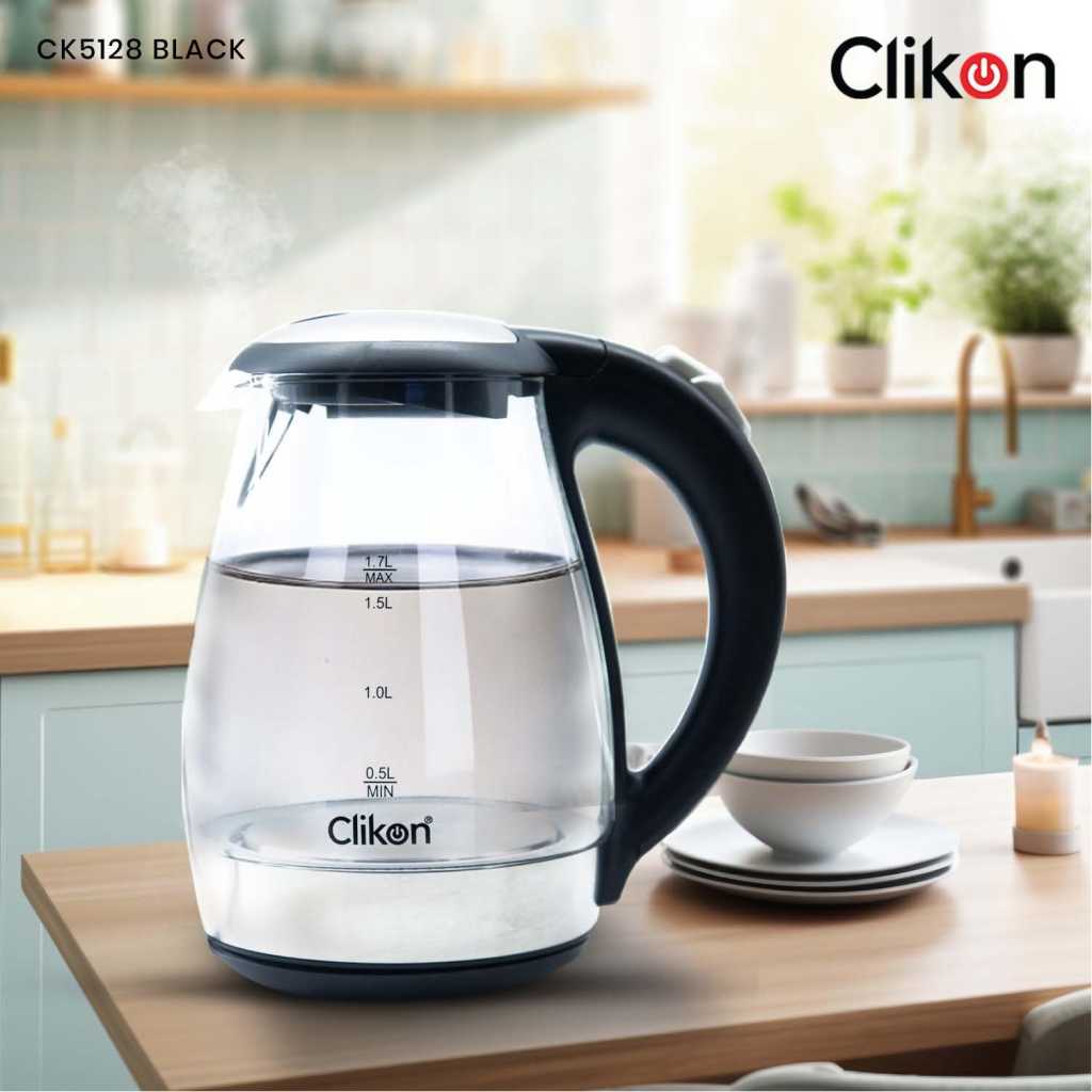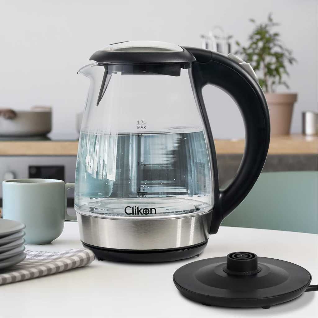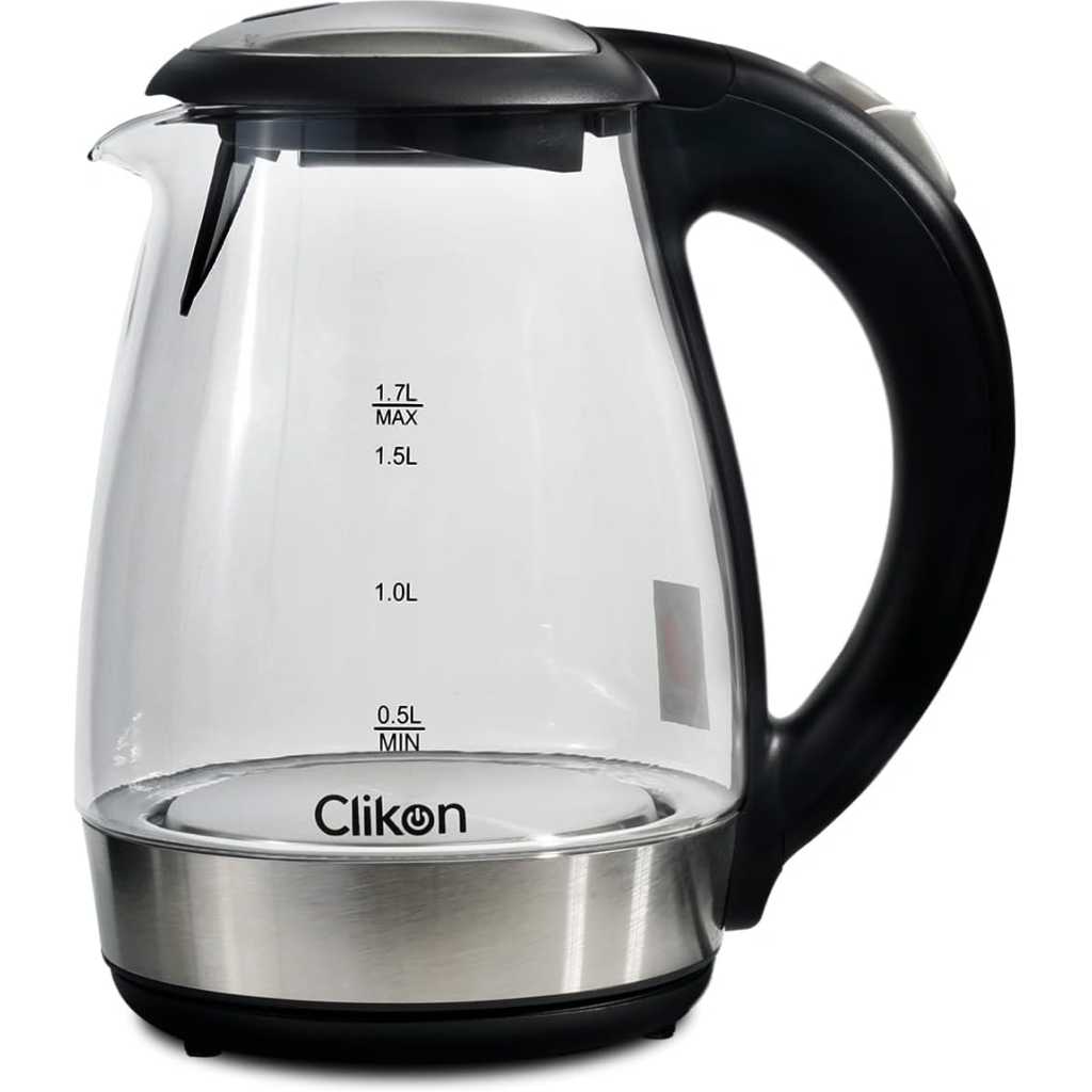 Equipped with 1500watts of power for fast heating. Clikon CK5128 glass kettle brings up to 1.7 liters of water to a rolling boil in a matter of minutes. which allows for steeping tea at just the right temperature. The glass kettle makes a quieter alternative to microwaving water and a safer alternative to boiling water on the stovetop-the kettle shuts off automatically, so there’s no need to worry if you forget and wander off. About this item 1.7-liter capacity 360 degree swivel cordless connector Stay-cool nonslip handle Concealed heating element to prevent mineral buildup Auto shutoff and boil dry protection