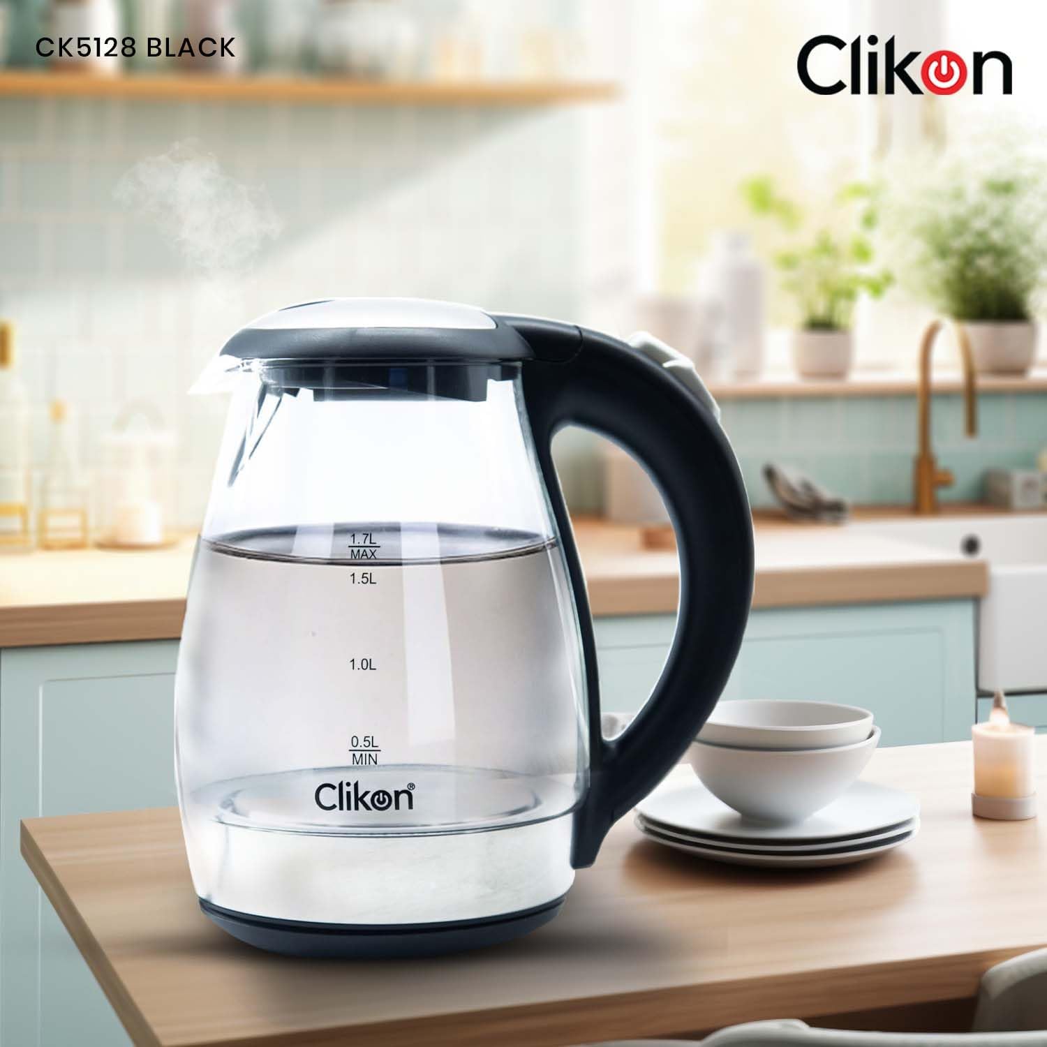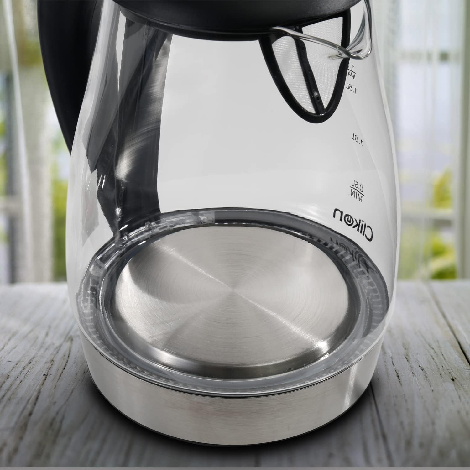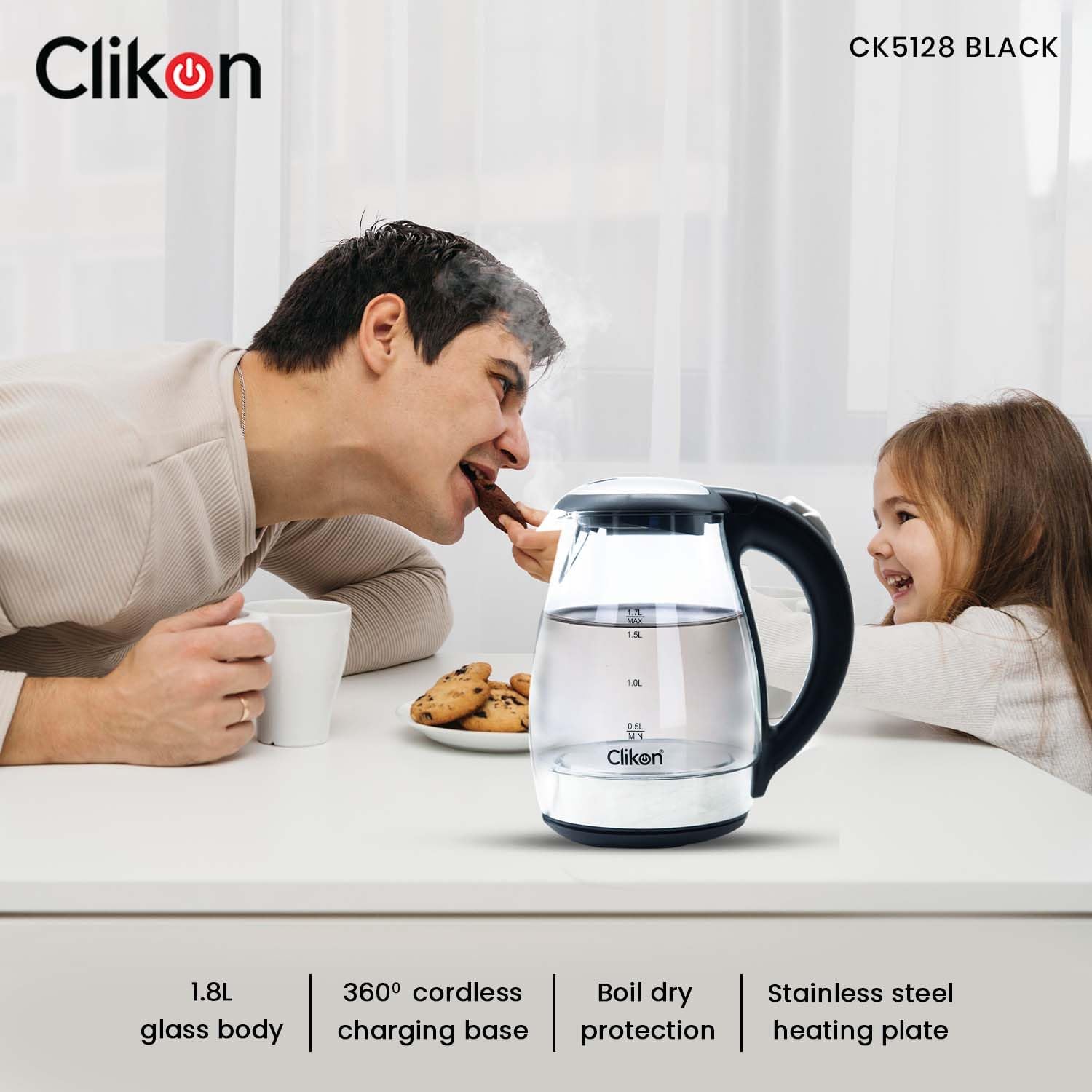 Equipped with 1500watts of power for fast heating. Clikon CK5128 glass kettle brings up to 1.7 liters of water to a rolling boil in a matter of minutes. which allows for steeping tea at just the right temperature. The glass kettle makes a quieter alternative to microwaving water and a safer alternative to boiling water on the stovetop-the kettle shuts off automatically, so there’s no need to worry if you forget and wander off. About this item 1.7-liter capacity 360 degree swivel cordless connector Stay-cool nonslip handle Concealed heating element to prevent mineral buildup Auto shutoff and boil dry protection