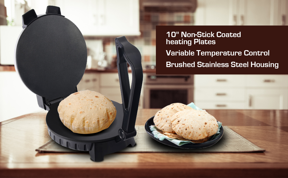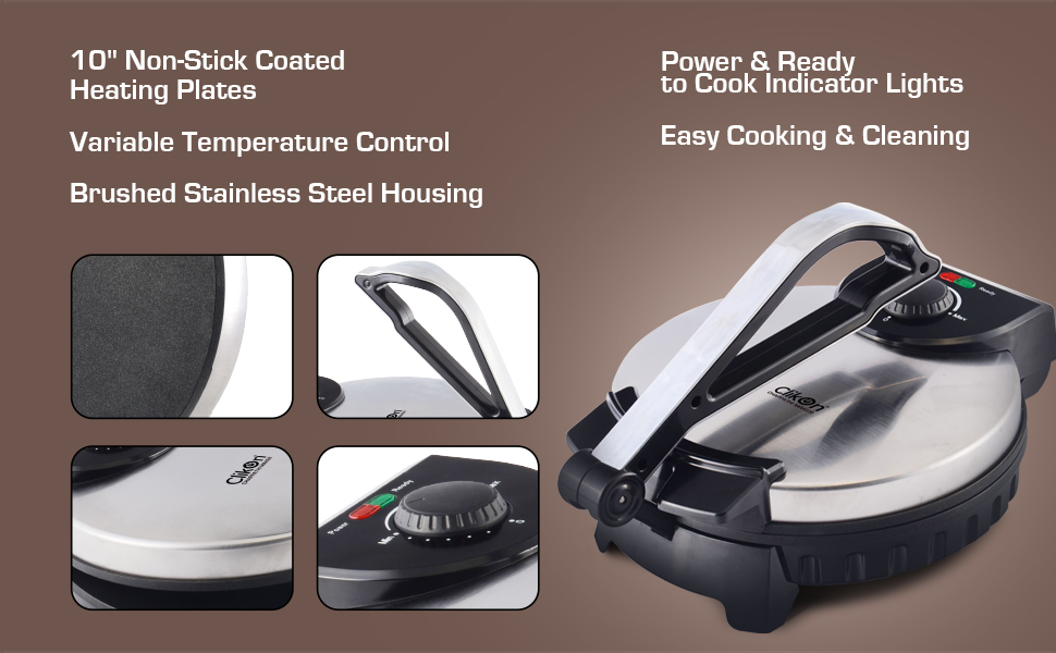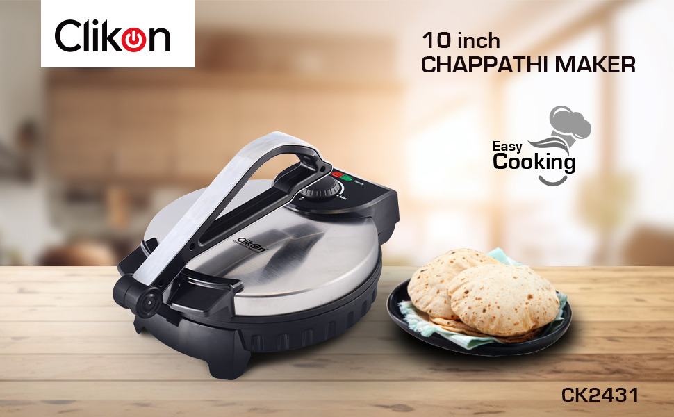 Effortlessly Prepare a Variety of Flatbreads The Clikon CK2431 is designed to effortlessly prepare a variety of flatbreads, including Tortilla, Wraps, Burritos, Roti’s, and more. Its non-stick surface ensures easy cooking and removal, while the cool-touch handle ensures safe handling. The power and ready indicator lights provide clear signals, while the control dial grants precise temperature adjustments for optimal results. The CK2431 chapatti maker is an essential addition to your kitchen. Key Features: Non-stick Coated Heating Plates Variables Temperature Control Brushed Stainless Steel Housing Power & Ready to Cook Indicator Lights Easy Cooking & Cleaning