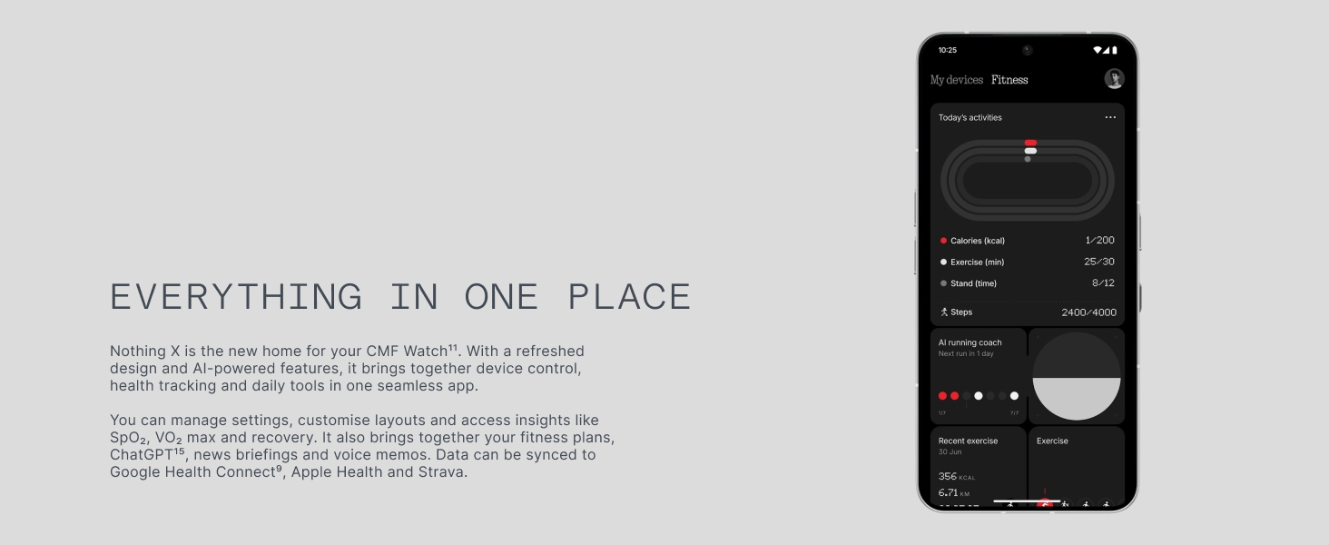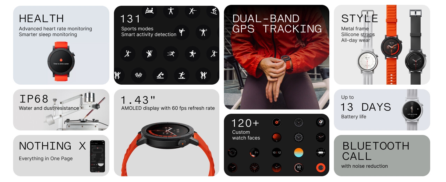 Key Features: Ultra-Accurate Health & Fitness Tracker: The CMF Watch 3 Pro smart watches enhance your fitness journey with advanced heart rate tracking (4-channel sensor, 10%+ accuracy boost), precise sleep monitoring (5%+ accuracy, sleep zone tracking), stress, SpO₂ levels, and L1+L5 Dual Band GPS for ultra-accurate navigation. The watch features 130+ exercise modes with GOMORE-powered performance analysis, 7-type motion recognition, plus daily health guidance for a smarter, healthier lifestyle. Your AI Life Companion: The CMF Smartwatch enables crystal-clear Bluetooth calls with AI noise reduction, a built-in mic, and speaker, supporting 30 contacts. New gesture control allows one-handed operation for calls, music, morning news, smart wallpapers, voice notes with transcripts & personalized fitness Coaching, and more. Requires Android 6.0 or iOS 13+. Download the Nothing X App 3.0, all on Your Watch!