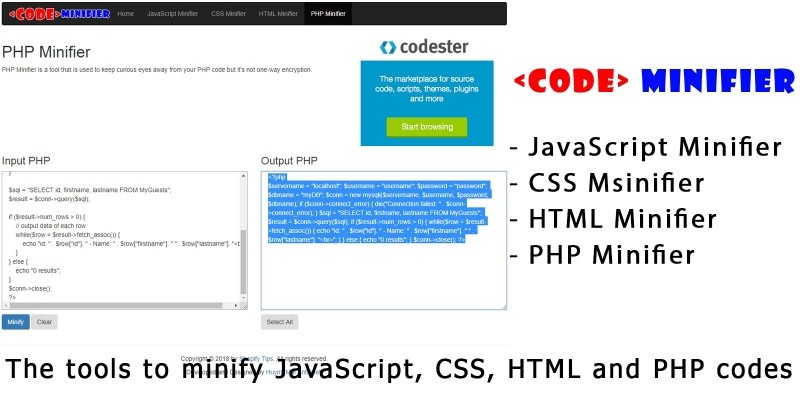 Code Minifier Script. The tools to minify JavaScript, CSS, HTML and PHP codes
