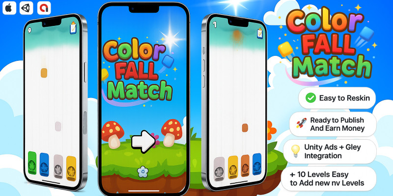 Color Fall Match - Casual Mobile Unity Game. Casual 2D Unity Game Source Code! Perfect for mobile, this game is optimized for Android & iOS. Built in Unity, easy to reskin