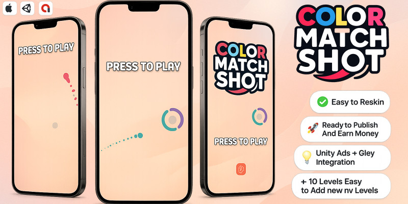 Color Match Shot - Casual Mobile Unity Game. Casual 2D Unity Game Source Code! Perfect for mobile, this game is optimized for Android & iOS. Built in Unity, easy to reskin