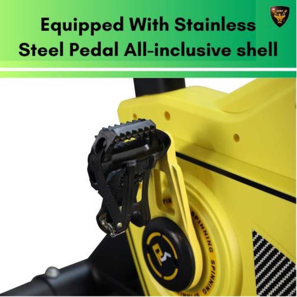 Key Features: 28 Kgs Flywheel For Heavy Commercial Use Maximum User Weight: 150 Kgs Machine Weight: 70 Kgs Two-way Belt Transmission Double Chip Resistance System Pull Resistance Way For Emergency Break Equipped With Stainless Steel Pedal All-inclusive shell The quality of the bike is premium and can be used for commercial purpose, home gym, society gyms, training centres, spin bike classes Available in two colours : Yellow & Black Self generation power mechanism