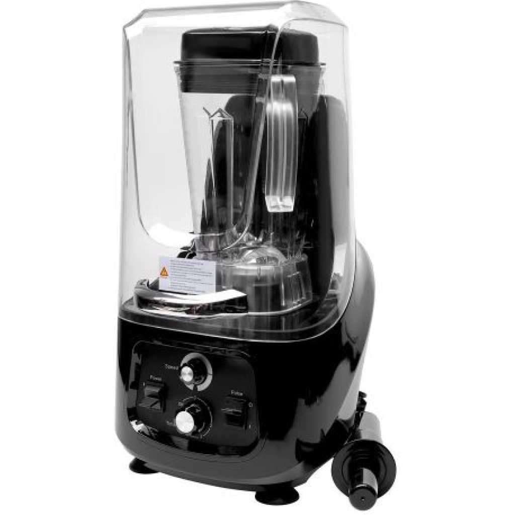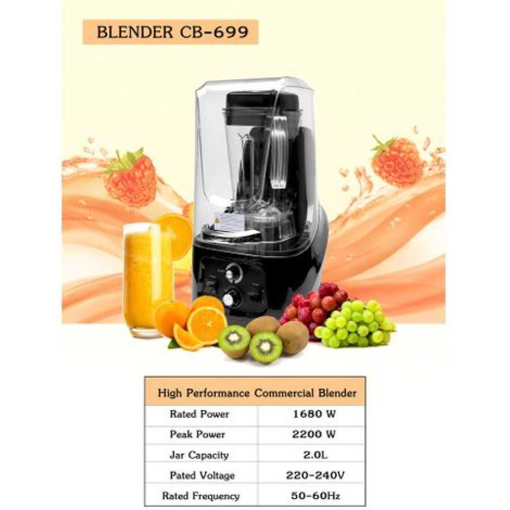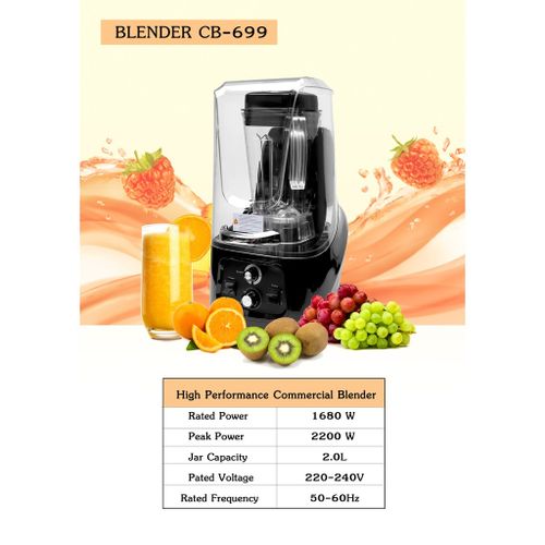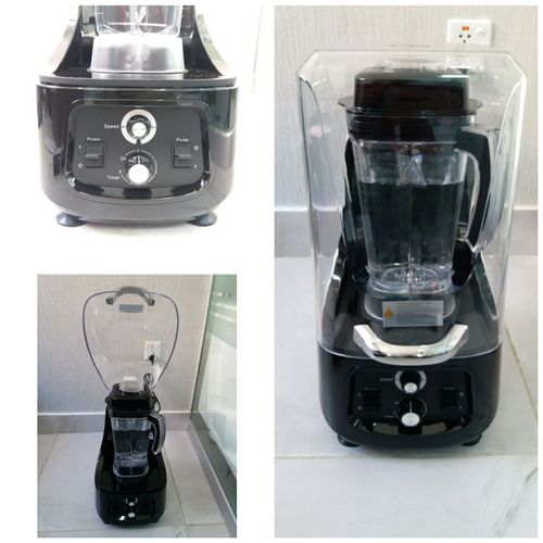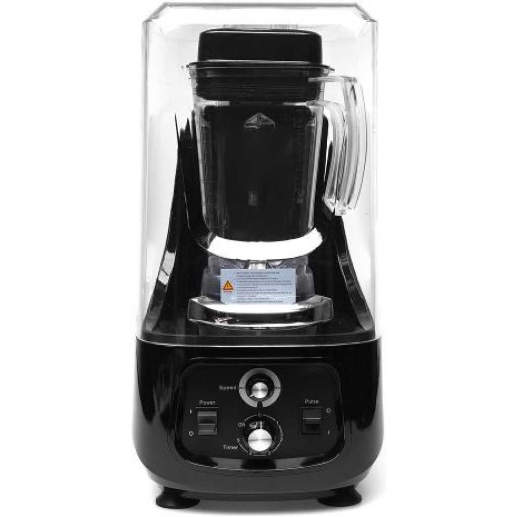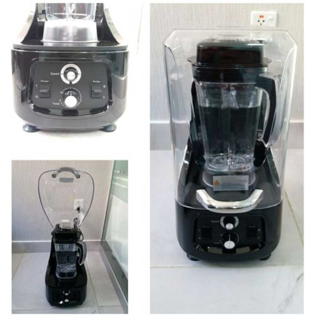 Commercial Ice Crusher Sound Proof Smoothie Blender Juicer With Timer Belt- Black. The base shell is made of ABS material, which is durable and quality guaranteed. The transmission is processed by secondary high-precision equipment, with high concentricity and low noise. The sealed soundproof cover greatly reduces noise and guarantees safety. A multifunctional smoothie machine can set the time and speed that you need. 3D six-leaf whirlwind blade is made of 420SUS material, which is super corrosion-resistant and produces more fine smoothies. 2. 2L capacity volume cup, pc material. A special heat dissipation system at the bottom, anti-noise sponge are installed at the fan blade of the motor to effectively prevent noise Soundproof cover blender Voltage: 110V/60Hz Capacity: 2.2L Product size: 31*27.8*54.8cm Color: Black Power:2.2KW/30000RPM Features 1. 36 groups of intelligent mixing. 2. Auto system operation, timing, and finishing with a light touch. 3. Two-speed pulse function. 4. Japanese steel material blades, tough and durable, never rust. 5. LED display, intelligent button, unattended operation. 6. Automatically display using time, remaining time, and safety class. 7. High-quality sound-proof housing, more than 60% of noise can be isolated. 8. High-security protection, be at ease use Key Features: Commercial Ice Crusher Sound Proof Smoothie Blender Juicer With Timer Belt- Black. [SOUNDPROOF DESIGN] High-quality sound-proof housing, more than 60% of noise can be isolated. YUIND quiet and soundproof shield professional blender reduces noises and also no splatter and leaking while you blending. [WIDE APPLICATION]This heavy-duty commercial blender adopts with big volume pitcher of 80oz (2.2L) which is suitable for families and parties. And easy to deal with smoothies, ice cream, salsa, sauce, nuts, hummus, shakes, and baby food and fitness persons. [HIGH EFFICIENCY] YUINDY professional countertop blender uses a powerful blade and 2200W motor together with dual-direction blade technology for powerful blending and consistent energy. High-speed professional countertop blender for shakes and smoothies with a two-speed pulse function. [DIGITAL DISPLAY MODEL]This blender is a digital display model LED display, intelligent button, unattended operation.