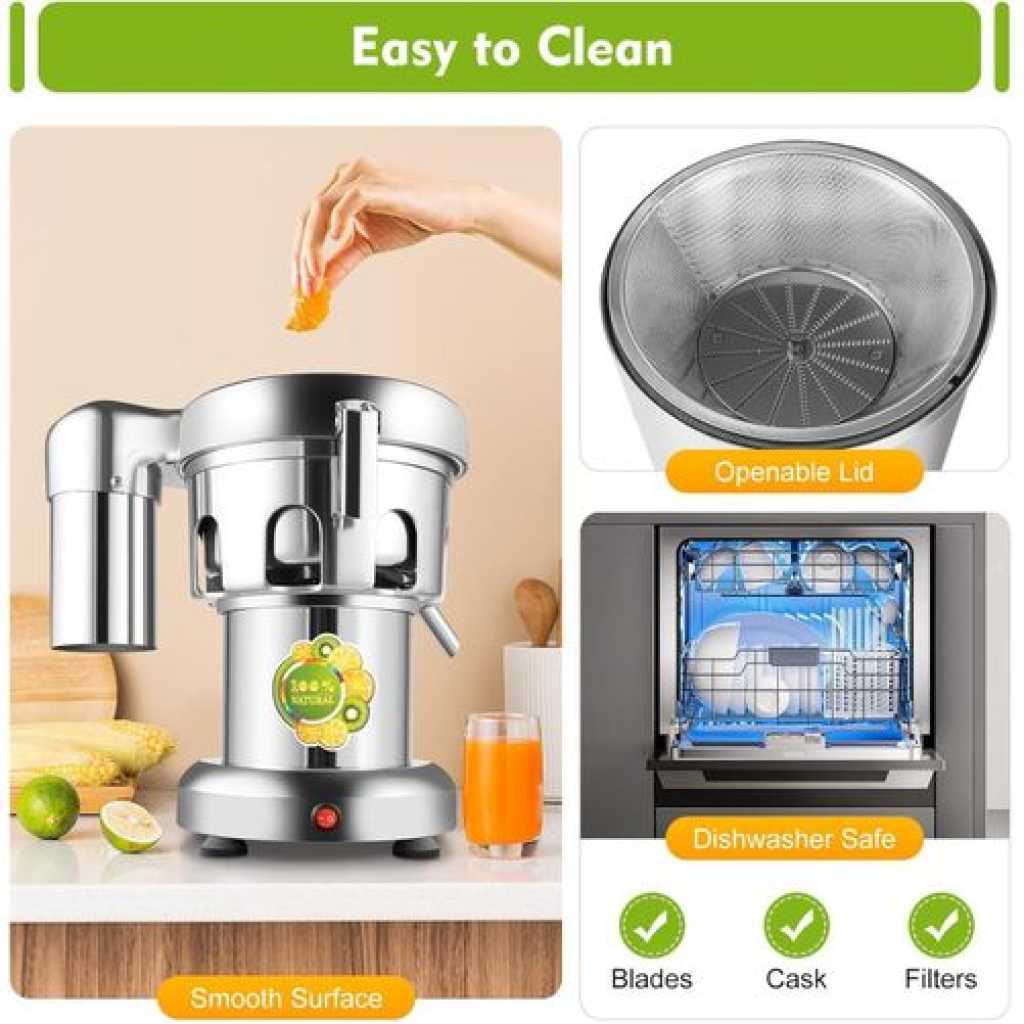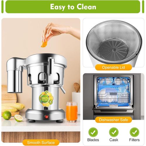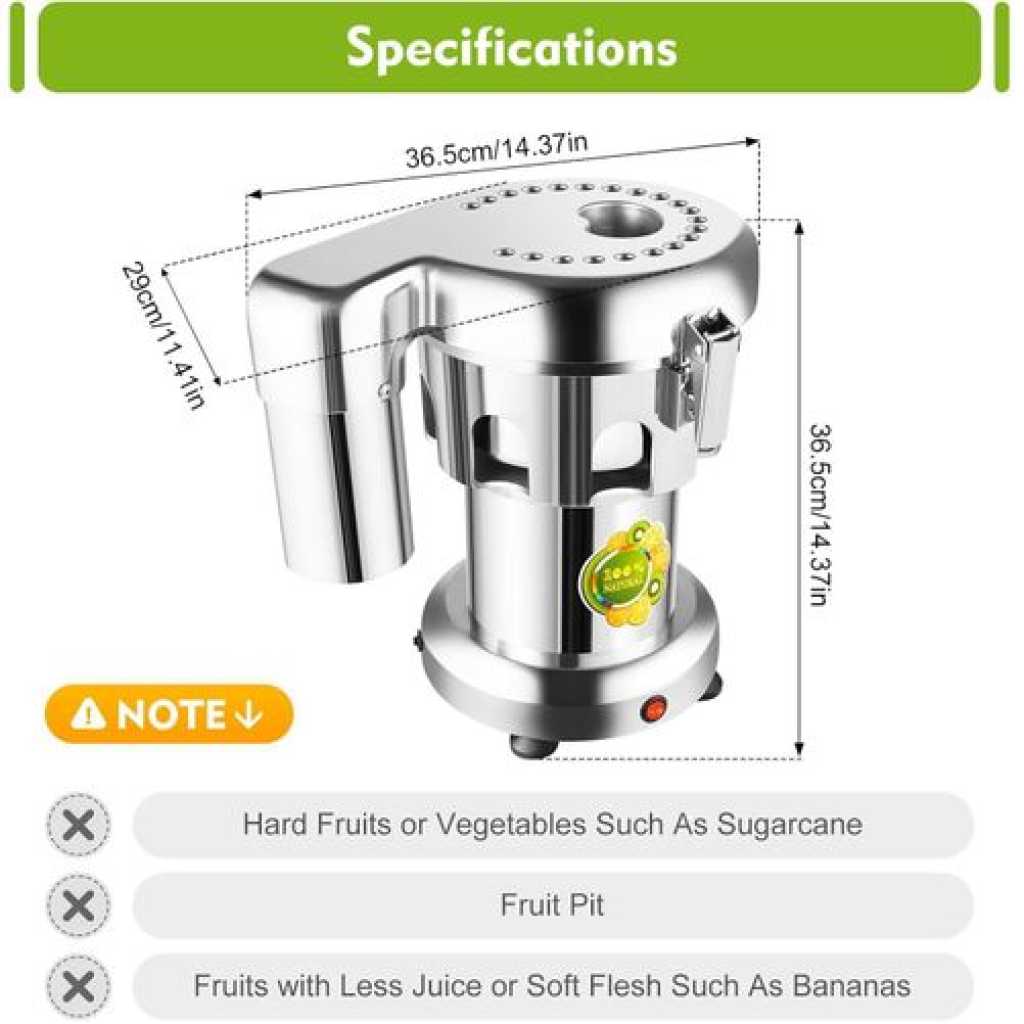 What Stands Out Heavy-Duty Design Built for commercial use, this centrifugal juicer boasts a robust stainless steel construction that ensures durability and longevity, catering especially to businesses in need of high-performance juicing solutions. High Juice Yield With an impressive output of 80-100 kg/hr, this juicer maximizes juice extraction efficiency, making it ideal for high-demand environments while reducing waste and increasing profitability for businesses. Whole Produce Juicing Designed for whole fruits and vegetables, this machine eliminates preparation time, allowing users to quickly create fresh juice while maintaining the natural flavors and nutrients without peeling or chopping. Product Details Constructed of food grade stainless steel and aluminum alloy for durability and rust prevention Operates at 2800 rpm and can produce 80-100kg/hr, requiring no pre-cutting of fruits Equipped with a round slag outlet and a food grade pushing rod for efficient juicing and easy clean-up Features a detachable juicing net, 304 stainless steel cutter net, and a stable base for enhanced convenience Suitable for juice shops, hotels, restaurants, and supermarkets, offering high juice efficiency and time savings Comes with a size of 340*70*360cm, AC110V voltage, and 370W power Fiber & Juice Separated: Designed with 5-grade gear transmission for less power consumption, driven by heavy duty motor. Juice and dregs are separated so no extra work is needed Improved Efficiency: 2800 RPM powerful machine. Three stainless steel rollers crushes fruits and vegetables to perfect result. 0.7″ (18 mm) large diameter juice outlet for quicker juicing. Food grade pushing rod helps food to contact with blades more sufficiently. Machine size:14.37×14.37×10.5 inches,please carefully confirm the electric juicer machine size before purchasing Highly Efficient: The 370W pure copper motor provides an amazing 2800RPM speed, effectively squeezing fruit pulp and significantly increasing juice yield to about 75%, our commercial juice machine can fully utilizing ingredients and bidding farewell to waste Considerate Design: Two tough buckles link machine body and lid tightly without leakage. Heavy duty base lowers center of gravity and ensures more stable operation. Simple ON/OFF and reset button for convenient usage. Foot pads reduce vibration Wide Application: Commercial juice extractor, easily juices various kinds of fruits and vegetables according to your own need. Large opening allow putting in whole raw materials. Great for juice shops, restaurants, hotels and family usage