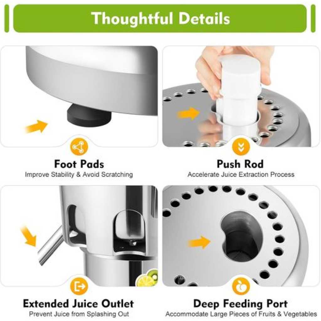 Key Features: Constructed of food grade stainless steel and aluminum alloy for durability and rust prevention Operates at 2800 rpm and can produce 80-100kg/hr, requiring no pre-cutting of fruits Equipped with a round slag outlet and a food grade pushing rod for efficient juicing and easy clean-up Features a detachable juicing net, 304 stainless steel cutter net, and a stable base for enhanced convenience