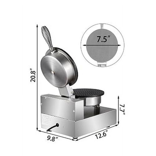 Product details is a leading brand that specializes in equipment and tools. Along with thousands of motivated employees, VEVOR is dedicated to providing our customers with tough equipment & tools at incredibly low prices. Today, VEVOR has occupied markets of more than 200 countries with 10 million plus global members. Why Choose VEVOR? 1.Tough Quality Assurance 2.Incredibly Low Prices 3.Fast & Secure Delivery 4.30-Day Free Returns 5.24/7 Professional Customer Service Product Description Commercial Ice Cream Cone Maker Our electric egg roll maker is constructed with a stainless steel body and cast-iron heating plates, featuring non-stick Teflon coating material. It is durable, sturdy, and easy to clean, with long service life. It is equipped with an internal temperature protector, which is reliable and safe. Temperature is 50-300℃ (122-572℉) adjustable, and the countdown timer setting is 0-5 minutes adjustable. With the advantages of clean, sanitation, smooth operation, and energy-saving, this professional waffle machine is ideal for both commercial and household. Stainless Steel Body The main body of the waffle bowl maker is constructed with high-quality thickened stainless steel material, with an attractive appearance. Durable, sturdy, and easy to clean. Parallel Heating Plates This ice cream cone maker comes with parallel heating plates, which are made of cast-iron. Three layers of non-stick Teflon coating surface prevent waffles from burning and make them easy to cook. Temp & Time Control The independent temperature controlling system is convenient to operate, with one temperature knob (50-300℃) and a timer knob (0-5 minutes) for precise control. Comfortable Handle The detachable handle of our ice cream waffle cone maker is made of stainless steel with a stylish spiral-designed appearance, which effectively prevents the handle from overheating. Stability & Reliability This Belgian waffle maker commercial is equipped with four rubber feet for enhanced stability during operation; The stainless steel bracket attached with two heating plates facilitates the free opening and closing. Multi-Functional Waffle Maker Our electric egg roll maker fits for the production of various crepes, such as egg roll, pizza, tortillas, pancakes, potato pies, ice cream cones, and so on. It is widely used in restaurants, cafeterias, etc. Specifications Rated Power: 1,000 W Plate Size: φ7.9″ (φ200 mm) Temperature: 50-300℃ (122-572℉) Timer Range: 0-5 minutes Gross Weight: 16.53 lbs (7.5 kg) Product Dimensions: 12.6″x9.8″x20.8″ (320x250x530 mm) Package Content 1 x Ice Cream Cone Maker 1 x Cone Forming Tool 1 x User Manual 【HEAVY-DUTY STAINLESS STEEL】- Our commercial waffle cone maker is solid, easy to clean, and reliable, due to the heavy-duty stainless steel material. With its high-quality stainless steel body, you can be assured that this cone waffle machine will be working for you for many years to come. 【PARALLEL HEATING】- The waffle cone maker machine adopts two heavy-duty cast-iron heating plates (7.9-inch in diameter). The parallel heating design enables both sides of the cone waffles to be heated evenly. The Teflon-coated, non-stick plates allow easy removal of waffle cones for quick and easy cleanup. 【PRECISE TEMP & TIME CONTROL】- The digital programmable controls with a countdown timer (0-5 minutes) ensure efficient and convenient operation. Our cone waffle maker is also fitted with a unique knob for precise control of temperature (50-300℃), featuring an indicator for showing the working status. 【WELL-DESIGNED DETAILS】- Slipping, overheating, and accidental burns are preventable due to the spiral design of stainless steel handle. Four rubber feet attached to the bottom of the ice cream cone maker facilitate enhanced stability. The bracket connected with two heating plates can support flexible closing and opening. It comes with a waffle cone forming tool for swift cone shaping. 【MULTI-PURPOSE WAFFLE CONE MAKER】- Due to its crisp texture, the waffle cones made by our ice cream waffle cone maker, go well with the creamy and soft ice cream of any flavors. It is widely used in organizations, schools, restaurants, cafeteria processing departments, and individual restaurants, making all kinds of egg rolls.