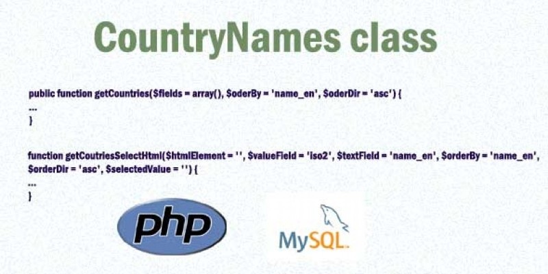Country Names PHP Class . This a provide CountryNames class that you can easily get list of country names from provided mysql database table and also build