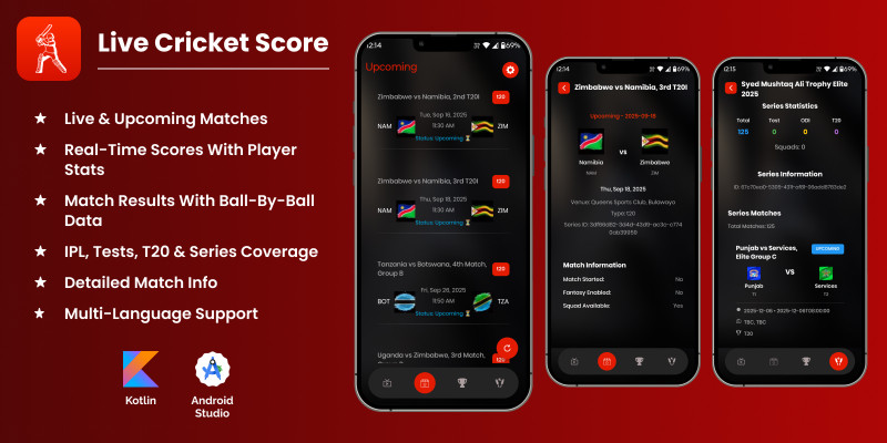 CricInfo - Android App Source Code. Cricket Companion App: live matches info, results, toss info, ball-by-ball data, and IPL/ODI/T20 coverage.