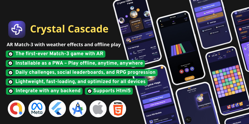 Crystal Cascade - Next-Gen AR Match-3 Game. Crystal Cascade is a premium HTML5 match-3 puzzle game with AR mode, dynamic weather effects, offline play and daily challenges