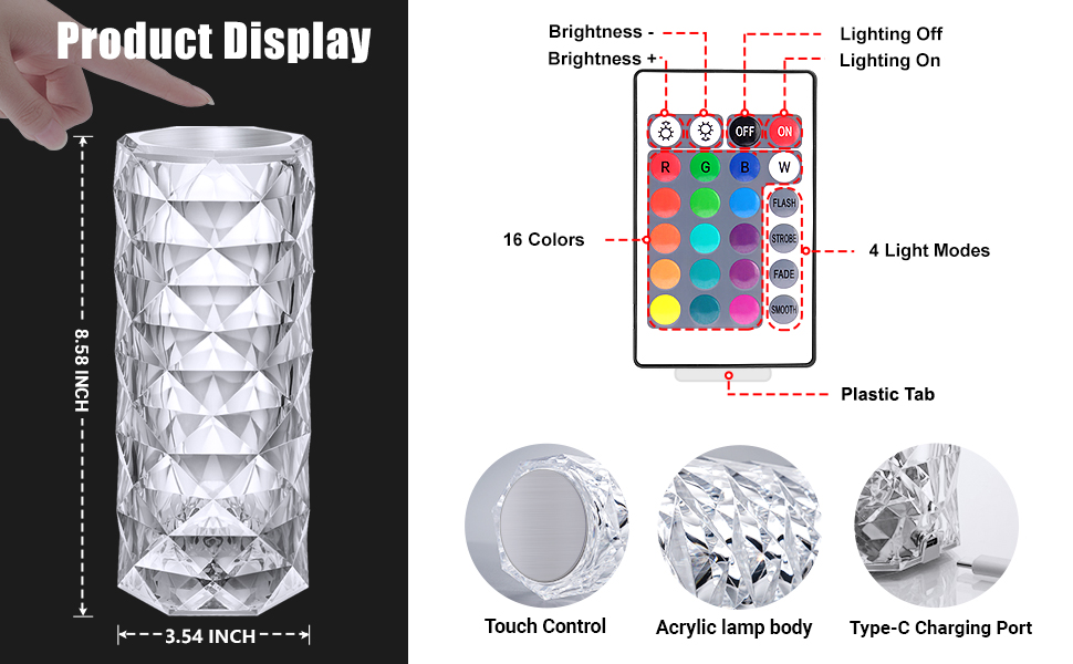 7even Touch Rose Crystal Lamp 7even Rose crystal lamp, it has 16 colors, the gorgeous 3D rose projection effect makes you feel like you are in the sea of roses, creating a romantic and warm atmosphere, it is very suitable for your lover, A romantic surprise for family and friends. 7even Crystal Lamp Size Perfect size and small footprint so you can use it anywhere. High-quality acrylic material, fine craftsmanship endows the lamp with a diamond-shaped cut surface, durable and beautiful. Two ways of touch control and remote control bring portability to your life. Choose from a variety of modes. Rechargeable (with Type-c charging cable), can work normally for 6-10 hours when fully charged. 7even Crystel Light Lamp Best Decorative Mood Lights for Friends Gathering/Party. It makes the perfect gift for your partner, family or friends for Christmas, Valentine’s Day, Mother’s Day, birthdays or anniversaries.