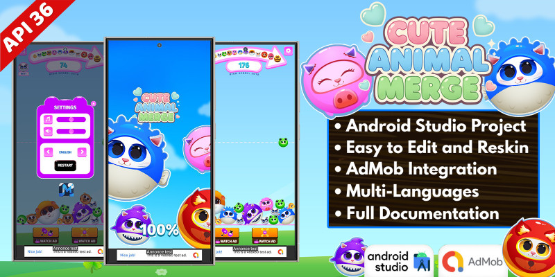 Cute Animal Merge - Android Game Template. An addictive and adorable 2D merge puzzle game. Drag, match, and evolve cute animals to build the ultimate pet collection!