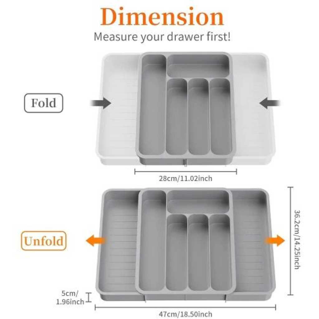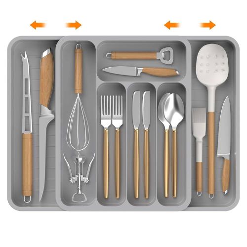 【Large Capacity】This silverware organizer has 7 compartments, which can efficiently classify and store most utensils in the kitchen, such as spatulas, ladles, knives, forks, spoons, whisks, etc., saving space on the kitchen countertop. 【Expandable & Adjustable】The kitchen utensil organizer has an adjustable width range of 11-19.7 in (28-50cm), fully expanded size is 19.7 x 14.3 x 2.1 in (50 x 36.4 x 5.3 cm), and the collapsed state size is 11 x 14.3 x 2.1 in (28 x 36.4 x 5.3 cm), suitable for most drawer sizes. Please measure your drawer before purchasing. 【Easy to Use and Clean】The adjustable cutlery silverware flatware holder is easy to use and clean, the edge design allows it to be moved easily. When cleaning, it can be rinsed directly with clean water and wipe with a clean rag (cannot be used in the dishwasher). 【Anti-slip Mats Design】The tableware storage box has anti-slip mats design on the bottom to prevent it from sliding on a flat surface or in a drawer, making it stable. And the cooking utensil organizer is made of BPA-free food-grade PP material, which can directly contact the tableware and can be used with confidence. 【Wide Range of Uses】Silverware organizer drawer has a large space and has different partitions. It can store various stationery, tools, tableware, knives and forks, cosmetics, toiletries, etc. It is used for drawers and countertops in bathrooms, garages, bedroom dressers, study rooms, and kitchens. use. Effective storage and quick access.