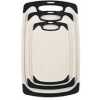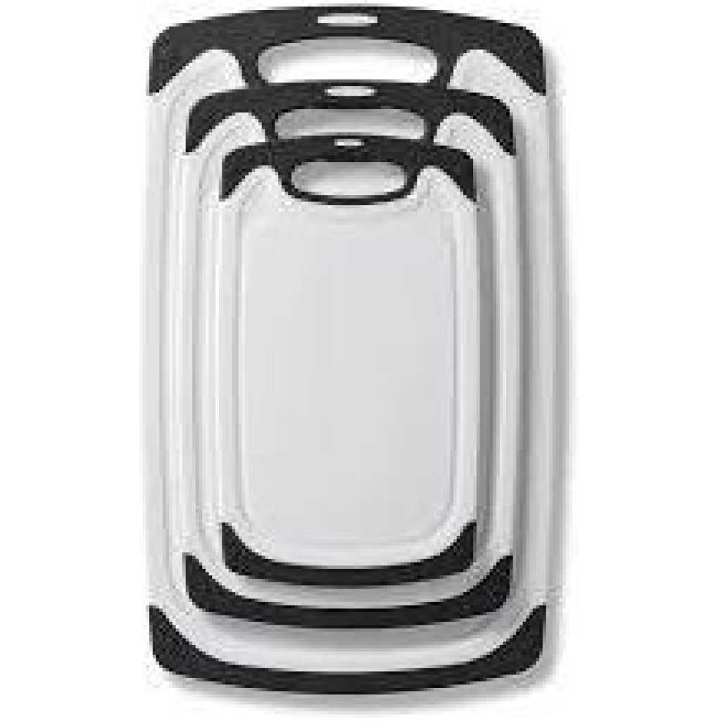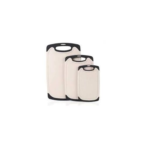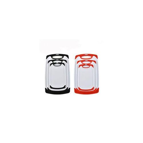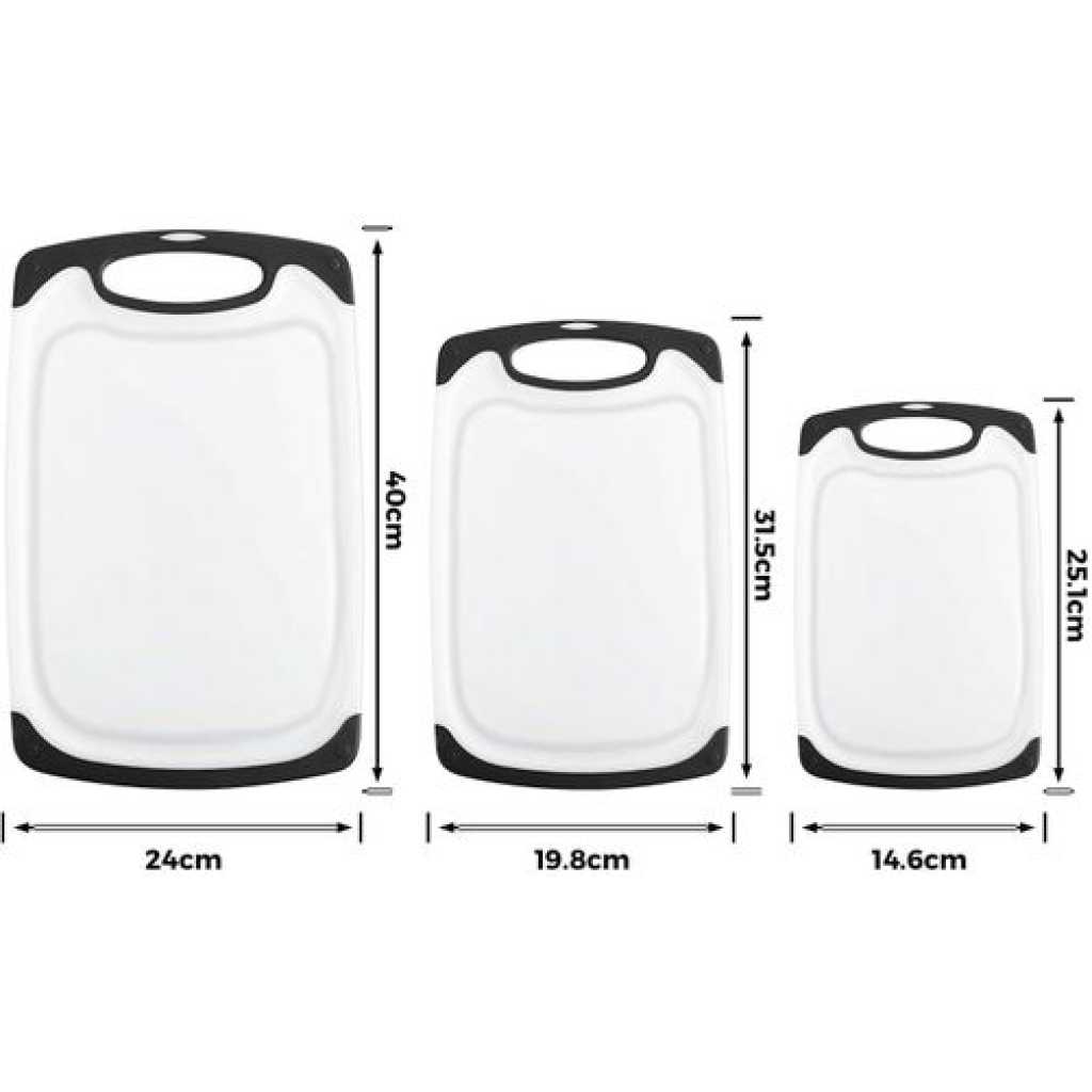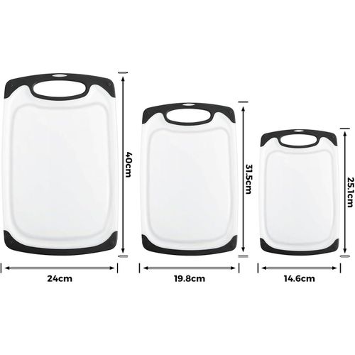 Premium quality: high-quality plastic with LFGB certifications. The chopping board set of 3 is made of excellent environmentally friendly PP plastic, it is completely free from harmful substances and does not smell of plastic. Perfect for cutting foods such as fruits, vegetables, cheese and meat. It is better than wood or bamboo as no bacteria can get into the material. Super preferable: one set of chopping boards includes three sizes: large (15.8 x 9.5 x 0.3 inches), medium (12.5 x 7.8 x 0.3 inches) and small (9.85 x 6 x 0.3 inches). You can choose a large plastic chopping board when cutting large meat, and when cutting fruit, a small chopping board, which is convenient for your life. Strong and lightweight: antibacterial and durable. Crack-resistant and lightweight. Grinding area for garlic, ginger and etc. Easy to use: cut and carve comfortably over your sink or kitchen surface. The kitchen boards are available in small and large. The boards are equipped with a drain groove to catch liquids wonderfully and keep your worktop clean. This set can be used as a cheese plate, for cutting bread, serving, as a sausage mat, when camping or for barbecuing. Easy to clean: dishwasher-safe is now a must in the kitchen. After chopping, chopping or preparing food, simply place the chopping boards in your dishwasher. Due to the high quality of the plastic used, they do not become porous, break or splinter.