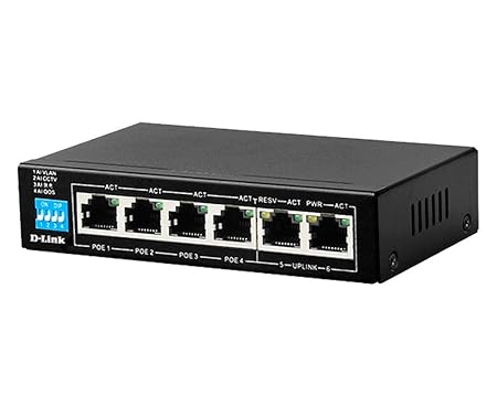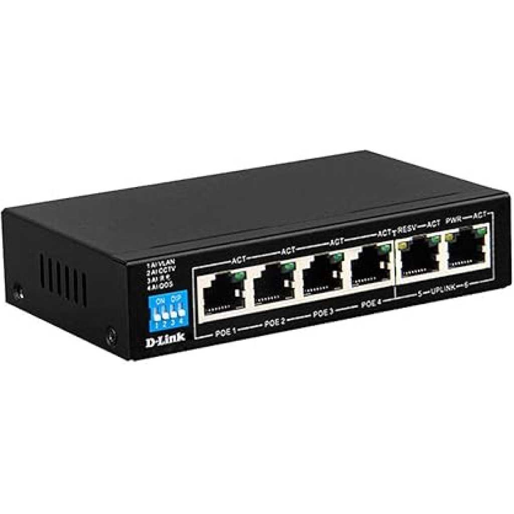 Key Features: D-Link DES-F1006P-E 6-Port Unmanaged PoE Switch, 4 x 10/100 Mbps Fast Ethernet Ports, 2 x 10/100 Mbps Uplink Port Power-over-Ethernet (60W), Flow Control For Protection Against Data Loss, Maximum Distance Of 250m 4 10/1 0OMbps Fast Ethernet ports 2 10/1 0OMbps uplink port 60 watts available for PoE Flow control for protection against data loss Maximum distance of 250m Standards IEEE 802.3 1 0BASE-T Ethernet (twist-pair copper) IEEE 802.3u 1 00BASE-TX Fast Ethernet (twisted pair copper) IEEE 802.3af Power over Ethernet IEEE 802.3at Power over Ethernet Easy to Use Plug-and-play installation IEEE 802.3x Flow Control Auto MDI I MDIX crossover for all ports Fanless device