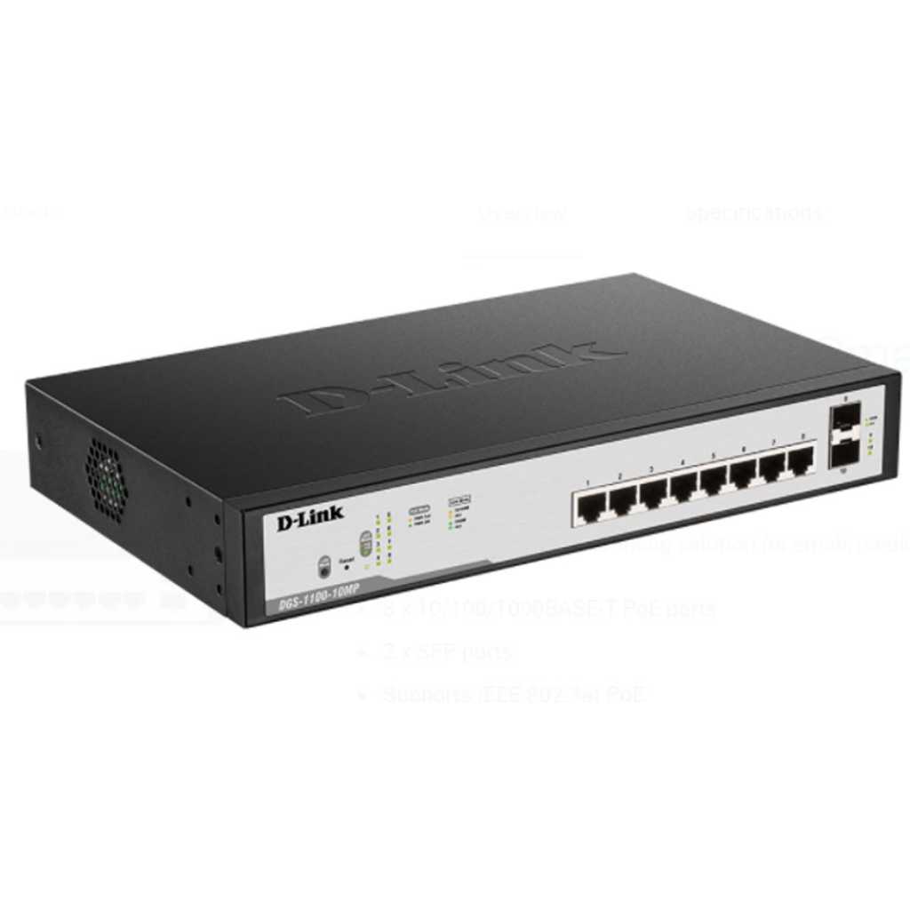 D-Link DGS-F1100-10PS-E 10-port Gigabit Smart Managed Switch, IPv6 Ready, Smart And Flexible Management, 8 x 10/100/1000BASE-T PoE ports 2 x SFP ports Supports IEEE 802.3at PoE, Innovative D-Link Green Energy Saving Features, Complete Web Interface, Comprehensive Switch Management, Smart Roaming, Seamless Network With The Same Network Name And Password, 6 Powerful Internal Antennas Per Unit DGS-F1100-10PS-E is a managed switch designed to meet the requirements of small, medium, and enterprise businesses. DGS-F1100-10PS-E supports multiple PoE standards make it ideal for IP surveillance deployments. Advanced management features, a range of diagnostic and troubleshooting tools, and energy efficient technologies provide a flexible solution to meet your networking requirements. Smart and Flexible Management Powerful switch management functions can be performed through the web management interface or through the client-based utility Gigabit Ethernet Speed High-speed ports provide the latest Ethernet technology while remaining backward compatible for connections to older computers and equipment. IPv6 Ready IPv6 compliance means that the switches are ready to meet future addressing standards, and are compatible with both your IPv4 and IPv6 network